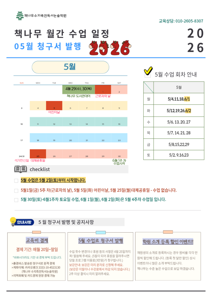 부쩍 더워진 날씨에 봄이 어느새 저만큼 가고 있습니다. 짧아진 봄이 더없이 아쉽지만, 창밖으로 펼쳐진 싱그러운 신록은 생명의 기운으로 가득합니다. 5월은 아이들의 달입니다. 봄에서 여름으로 넘어가는 계절처럼 우리 아이들도 한 뼘 더 성장하며 푸르게 자라나고 있습니다. 아이들을 위한 5월을 기쁜 마음으로 맞이하며, 이번 달 수업 일정과 주요 안내사항을 전해드립니다. 1. 5월 수업 일정 안내 5월 수업 시작: 5월 2일(금) 수업 일정 특별 안내 책나무는 매달 회차 수업으로 운영됩니다. 공휴일이 있어도 따로 보강을 잡을 필요 없이 수업 계획이 짜여 있습니다. 5월 30일(금): 6월 수업 시작 6월 1일(월) ~ 2일(화): 5월 4주....... <img src="https://blogthumb.pstatic.net/MjAyNjA0MjBfMjQw/MDAxNzc2NjU4MTEwMTgw.eMFBFBWc8tM5TgYa6I5RAguesgc1j176WewcBh7GLQog.mjp5yyazHXgyfTKkT2Ug_tjmqZOcIld618gFmiTR62cg.PNG/1.png?type=s3" />