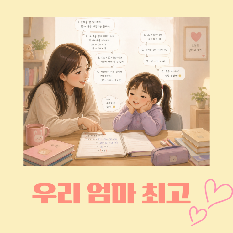 지금 가정에서 아이와 함께 수학 공부를 어떻게 해주고 계시나요? 아이와 함께 수학을 공부하다 보면, 어느 순간 이런 모습이 자연스럽게 반복되곤 합니다. “문제부터 같이 읽어볼까?” “이건 어떻게할까? 더하면 되겠지?” 엄마의 친절한 설명 속에서 아이는 편안하게 문제를 따라갑니다. 분명 아이는 이해한 것처럼 보이고, 문제도 잘 풀어냅니다. 그래서 더 헷갈립니다. ‘이 정도면 잘하고 있는 거 아닐까?’ 하고요. 하지만 한 번쯤은 생각해볼 필요가 있습니다. 지금 이 공부는 아이의 공부일까요, 아니면 엄마의 공부일까요? 아이에게 수학은 ‘설명을 듣는 과목’이 아니라 스스로 고민하고, 생각해보고, 판단하는 경험의 과목입니다. ....... <img src="https://blogthumb.pstatic.net/MjAyNjA0MjVfMjc2/MDAxNzc3MDgyNjU2MzU5.EvN5xyAypA9wwGPGdV6OzSwH6Sgr1yXDbXlKuTto6rEg.FsIwSrM4otwdT-LhGkrGTAvQzXyNo1ORLR-lz64rhx4g.PNG/%BF%EC%B8%AE%BE%F6%B8%B6%C3%D6%B0%ED.png?type=s3" />