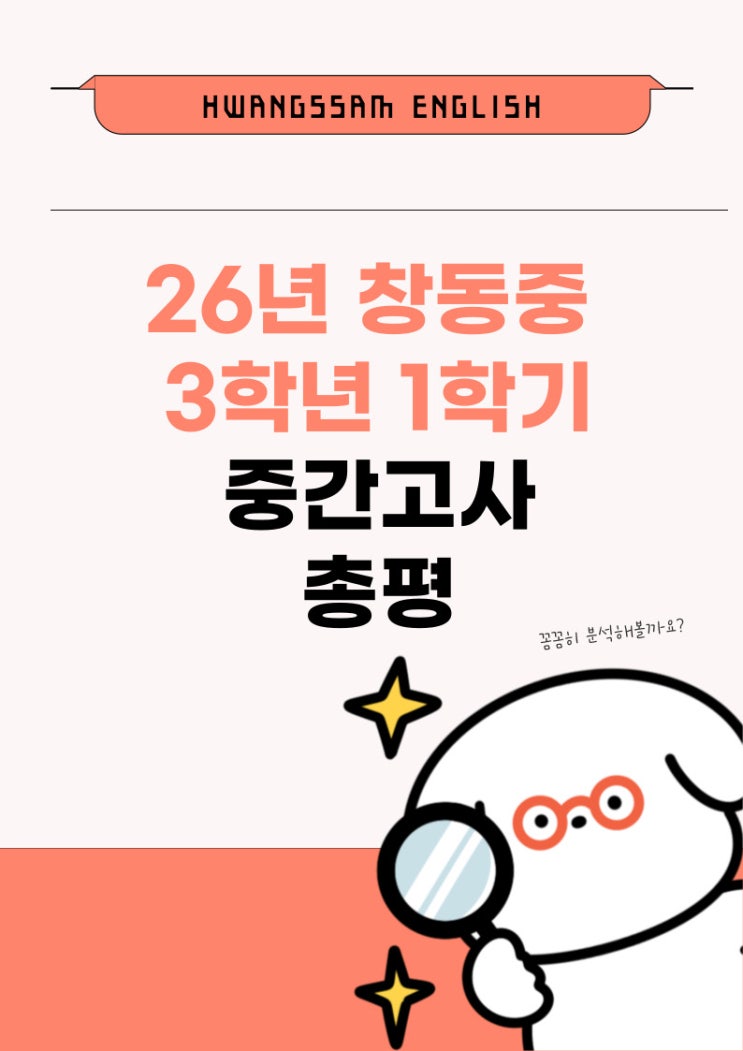 3학년 1학기 중간고사 분석 영어 · 총 32문항 객관식 안녕하세요. 별을키우는 사람들 황쌤영어학원 현미쌤입니다. 이번 창동중 3학년 1학기 중간고사는 총 32문항 객관식으로 출제되었습니다. 출제 범위는 1과 12문제, 2과 16문제, 통합 4문제로 구성되었으며, 유형별로는 어법 9문항, 어휘 8문항, 빈칸 6문항, 내용일치 5문항, 기타 4문항이었습니다. 유형별 분석 1 어휘8문항 전반적인 난이도 평이하였으나, 이해를 통한 응용력이 필요한 문항들이 섞여 있었습니다. 단어의 단순 암기를 넘어서, 파생어·영영풀이·명사-동사 관계, 영어권에서 사용법까지 이해해야 하는 문항들이 출제되었습니다. 2 어법9문항 1과와 2과의 목표 어법을 고르게 다....... <img src="https://blogthumb.pstatic.net/MjAyNjA0MzBfMTU1/MDAxNzc3NTIzMDUwMjM0.iW0GcLAp04qTZdx1q_LIKzung2TkWHVXaqrfJEXs7X4g.UswPs49w8f3x0HstyyOo-oCLGF6wsnllc8Qk_zw23MEg.JPEG/001.jpg?type=s3" />