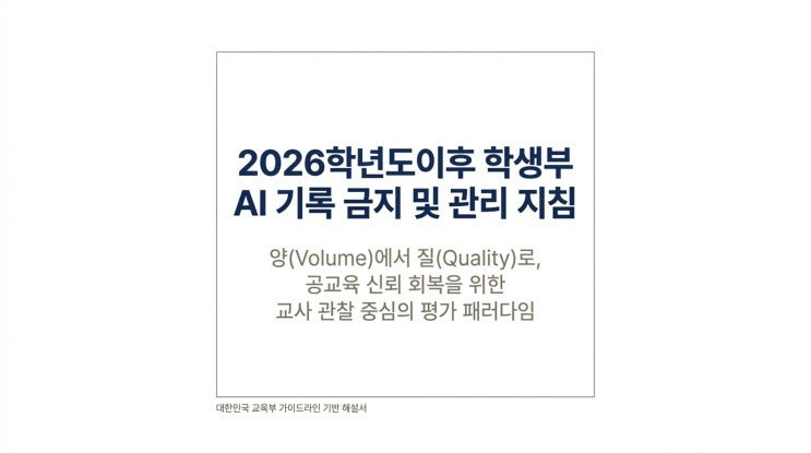 2026 학생부 대변혁: AI가 쓴 문장은 왜 '0점' 처리가 될까? 공교육 신뢰 회복의 시작 1. 편리함을 이긴 '진실성'의 가치 생성형 AI가 단 몇 초 만에 논문을 요약하고 유려한 문장을 작성하는 시대입니다. 기술의 편리함이 정점에 달한 지금, 역설적이게도 대한민국 교육계는 가장 '아날로그'적인 결단을 내렸습니다. 2026학년도 학교생활기록부(이하 학생부) 기재요령의 핵심은 '생성형 AI 활용 기록의 전면 금지'입니다. 이 변화는 단순히 새로운 기술에 대한 거부감이 아닙니다. 오히려 AI라는 매혹적인 지름길이 학생 개개인의 성장을 가리는 역설을 바로잡으려는 시도입니다. 이번 조치가 지향하는....... <img src="https://blogthumb.pstatic.net/MjAyNjA0MjFfMTQ4/MDAxNzc2NzQ5ODkzNDY5.OfLH-aAJCxmkFPDEgOuKgpKW0pgK6JoZyxuyeMEtyewg.xta1v1ILtQSYO8O60rVEgiOwQ8l2CNA5L_whSYf7_Gsg.JPEG/cleaned_2026_Student_Record_AI_Guidelines_%282%29_1.jpg?type=s3" />