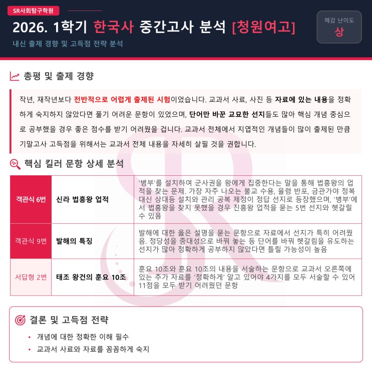 안녕하세요^^ SR사회탐구학원 입니다~~ 청원여고 1학기 중간고사 한국사 시험 분석 결과입니다~~ 1학기 기말대비 시간표 ⭐현재 수강신청 접수중 입니다!!⭐ SR의 수업은 항상 빨리 마감됩니다!! 수강문의나 상담은 학원카톡(SRsatam) 전화 02-930-8880 (내선 1번 과탐, 내선 2번 사탐) <img src="https://blogthumb.pstatic.net/MjAyNjA0MjNfMjEy/MDAxNzc2OTMwNTgwMjA2.hfUgNp3WEHpMZ6VDHAT0d4sFPpQxjakcbzZRu04GUV8g.578lPPZBAWL34v1RNsB8cE1gGt2OCU-8Z4YIMy2Y1EAg.JPEG/2026_1%C7%D0%B1%E2_%C1%DF%B0%A3%B0%ED%BB%E7_%BA%D0%BC%AE_%28%C3%BB%BF%F8%BF%A9%B0%ED%29_1.jpg?type=s3" />
