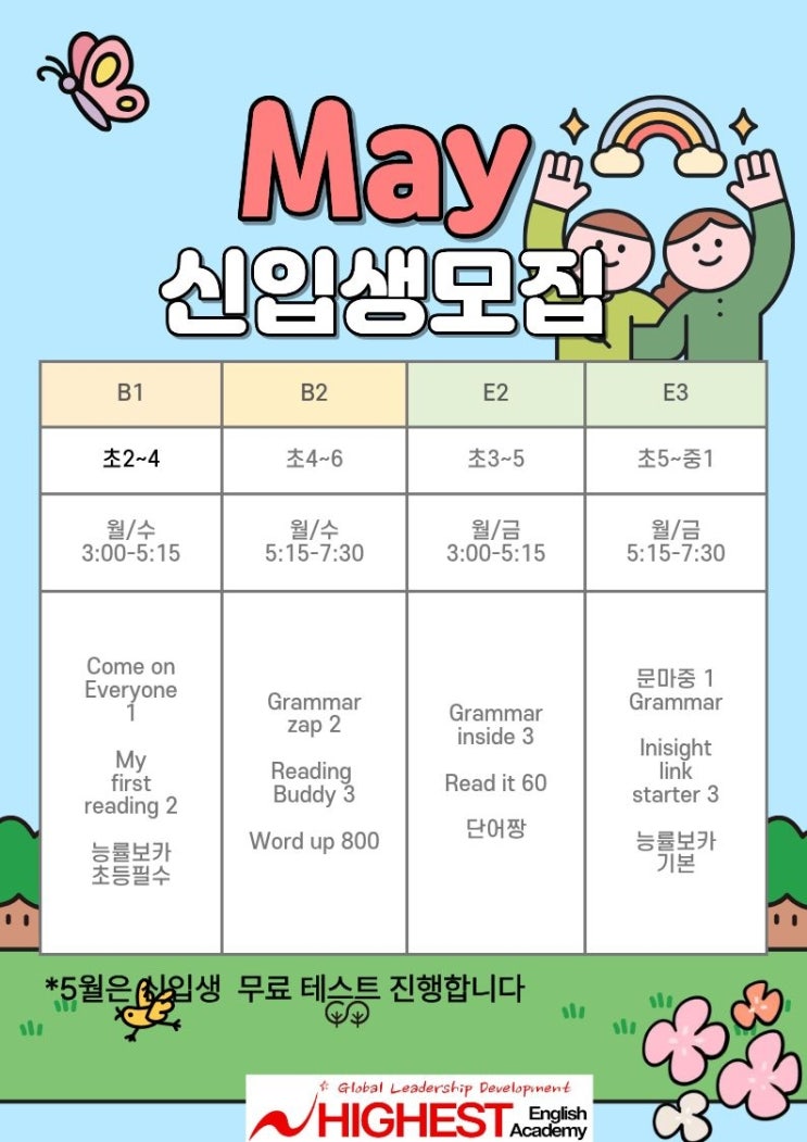 5월은 가정의 달입니다. 우리 하이스트 학생들은 문법에 맞춰 Writing 연습을 하며 자신있게 발표할 수 있도록 Speaking과 PPT 발표를 꾸준하게 연습하고 있습니다 또한 Listening 하면서 동시에 Dictation하는 능력을 키우기 위해 듣기 연습에도 중점을 두고 있습니다. <<5월 수업 안내입니다>> Class :B1 대상 : 초2-초4 시간 : 월/수 3:00-5:15 교재 : My first reading 2, Come on everyone 1, 능률 보카 초등 필수 내용 : 영어 읽기 연습과 발표, 발음 교정 및 발음하는 방법과 단어 암기 Reading 주제별 어휘와 문장 패턴 학습 일상 관련 어휘와 표현을 익히고 교실 활동을 통해 말하기 연습 Class : B2 대상 : 초4-초6(중등대....... <img src="https://blogthumb.pstatic.net/MjAyNjA0MjFfNSAg/MDAxNzc2NzUyNjIyMDM0.5jYmvp7GKqn9UHDm_ssX6zMbt9-DqgqLJgmrp2ewb8Qg.HRHUGZl-gicUUocWdjoTTMzEJlC9yUhCcSxfI1t8cukg.JPEG/%C3%CA%B5%EE%BF%B5%BE%EE.jpg?type=s3" />