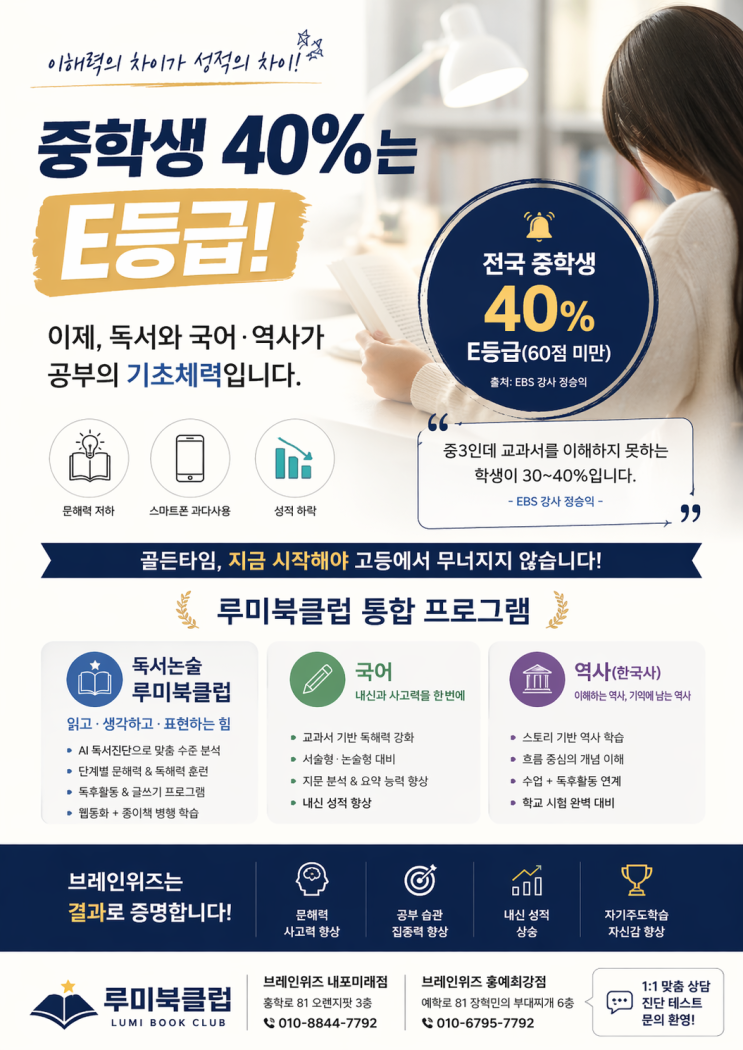 안녕하세요? 미래를 리드하는 인재를 양성하느 곳 내포·홍성·예산 국영수 독서논술 종합학원 브레인위즈 입니다. 중간고사 기간이 지나가고 있습니다. 그리고 이 시기, 학부모님들께서 하시는 말씀은 비슷합니다. “우리 아이, 분명히 공부했는데 왜 성적이 이럴까요?” “수학만 문제인 줄 알았는데… 전체적으로 걱정이 됩니다” 현장에서 아이들을 지도하며 느끼는 것은 단 하나입니다. 문제는 한 과목이 아닙니다 중간고사로 드러난 진짜 문제 시험은 단순히 점수를 확인하는 과정이 아닙니다. 아이의 학습 구조가 그대로 드러나는 순간입니다. 많은 학생들이 이렇게 공부합니다. 수학은 문제만 반복 영어는 단어 암기 중심 국....... <img src="https://blogthumb.pstatic.net/MjAyNjA0MjNfMTg1/MDAxNzc2OTQ0OTExNTIx.b2sIu63FlKJjnLaZk7cdp4WruTf8DZtZQBKhrn2nccMg.4lKGd0skprPOqUYklqw8BfbNO1Ojb3u2fQsaM1ZDKmsg.PNG/ChatGPT_Image_2026%B3%E2_4%BF%F9_23%C0%CF_%BF%C0%C8%C4_07_55_25.png?type=s3" />