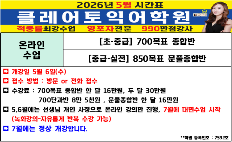 [2026년 5월] 클레어토익 강의 시간표 OPEN! 목표 점수 달성을 위한 가장 확실한 선택! 5월에도 클레어와 함께 토익 끝내버려요 ✅ 5,6월에는 선생님 개인 사정으로 온라인 강의만 진행합니다 ✅ 7월부터 대면 수업 시작합니다. ✅ 온라인 수업은 녹화강의로 원하는 시간에 반복수강 가능해요! ✅ 대면강의와 똑같은 빡센 강의와 더 빡센 과제로 토익 공부 제대로 시켜드립니다 :) 수강 문의: 010-2846-2401 <img src="https://blogthumb.pstatic.net/MjAyNjA0MjBfMjQx/MDAxNzc2NjY0NTQwNzkw.HKdg-yQyWKzNKsvRfB5Abl36RUIGEPBnKCmBvhstrXYg.v-cQ8mFJ_z3w2dOB90cl9g9BMZaB3_D8s1hIN_s67v0g.PNG/26%B3%E2_5%BF%F9.png?type=s3" />