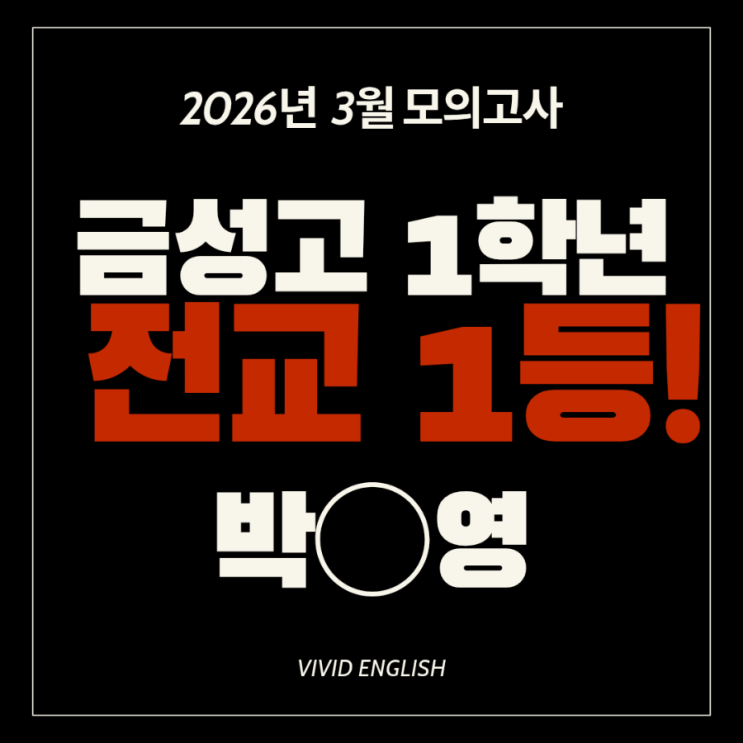 26년 3월 전국연합 모의고사 영어100점!1등급! + 전과목 전교 전체 1등 . 이번 3월 모의고사는 특히 영어 영역이 어렵게 출제되어 여러 뉴스에서도 화제가 되었는데요, 그 속에서 비비드의 시조새 Jessica!! 당당히 영어 100점, 1등급을 받아내고 더 나아가 전교 전체 1등이라는 값진 결과를 이루어냈다는 기쁜 소식을 전합니다. . 선배들이 보여준 좋은 흐름을 이어받아, 이번에도 우리 비비드의 학생이 또 하나의 멋진 성과를 만들어냈습니다. . 초등 시절부터 오랜 시간 비비드와 함께하며 차근차근 실력을 쌓아온 영어 실력이 결국 이렇게 큰 결과로 이어졌습니다. . 성적은 하루....... <img src="https://blogthumb.pstatic.net/MjAyNjA0MDdfNiAg/MDAxNzc1NTcwMjM5NDQ5.KRjj55siczyA25gewGjVBw9btqzZOsNOXl5Tjxt-wLAg.V8MVye8lidctsbAlPY36bJj5x83N-B5m_RdLytd0mpEg.PNG/900%A3%DF%BE%C6%C0%CC%BA%B8%B8%AE_%BA%ED%B7%E7_%B9%CC%B4%CF%B8%D6%C7%D1_%B0%F8%C1%F6_%C0%CE%BD%BA%C5%B8%B1%D7%B7%A5_%B0%D4%BD%C3%B9%B0%A3%DF20260407%A3%DF225704%A3%DF0000.png?type=s3" />