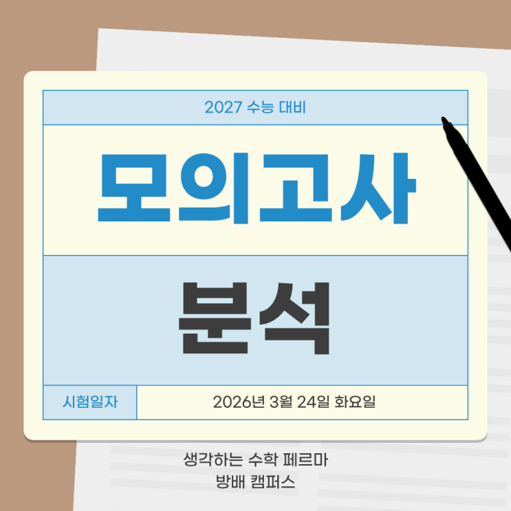 안녕하세요. 생각하는 수학 페르마 방배 캠퍼스입니다. 오늘은 지난 3월 진행한 고3 3월 모의고사에 대해 분석해드리고자 합니다~! 3월 모의고사 분석 3월 모의고사는 단순한 연습 시험이 아니라, 실제 수능의 흐름을 미리 가늠해볼 수 있는 중요한 기회입니다. 특히 고3 학생들에게는 현재 자신의 실력을 객관적으로 확인하고, 앞으로의 학습 방향을 다시 점검할 수 있는 출발점이 됩니다. 국어 영역은 전체적으로 체감 난이도가 다소 높게 느껴졌다는 반응이 많았습니다. 특히 독서 영역에서 지문의 길이와 정보량이 늘어나면서, 단순히 내용을 이해하는 것뿐만 아니라 글의 구조를 빠르게 파악하는 능력이 중요해졌습니다. 실제로 많은 학생들....... <img src="https://blogthumb.pstatic.net/MjAyNjA0MTNfODAg/MDAxNzc2MDc4MjMzNjM2.q63ubDXZqxsoP9notYCQmkNNCe1ZmZxsdJbIyorbvYQg.3yDYALoopEcjo_xEHqMQ6b3MeGAx8blmW_jFz4dxricg.PNG/4.png?type=s3" />