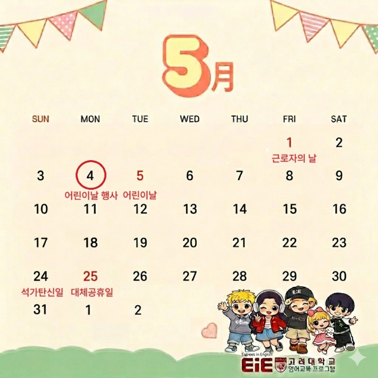 5월 세션 일정 안내 5월 세션 : 5월 1일 ~ 6월 2일 5월 1일, 5월 5일 : 공휴일 5월 4일 : 어린이날 행사 5월 25일 : 대체공휴일 아이의 영어 실력이 제자리걸음인 것 같아 마음 졸이셨나요? 서두르지 않으셔도 됩니다. 아이의 속도에 맞춰, 하지만 방향은 정확하게 함께 걷겠습니다. 상담실의 문은 언제나 부모님들의 고민을 듣기 위해 열려 있습니다. 상담 가능 시간: 평일 오후 2시 ~ 7시 (예약 필수) 상담 문의: 010-2329-2952 #초등영어 #중등영어 #내신대비 #영어교육 #영어학원추천 #EiE어학원 #5월개강 #자기주도학습 #영어공부법 #교육철학 <img src="https://blogthumb.pstatic.net/MjAyNjA0MjdfMTU3/MDAxNzc3MjgyNDIxOTYx.zdMzngphUCK-RDLjB8j-f0YX8erm-kiQMDUqW9MAXS0g.TJcZfzMWweO_kAI2ILsH7nACrg0mns-z9NIgPLgirMYg.PNG/5%BF%F9_%B4%DE%B7%C2_%C3%D6%C1%BE.png?type=s3" />