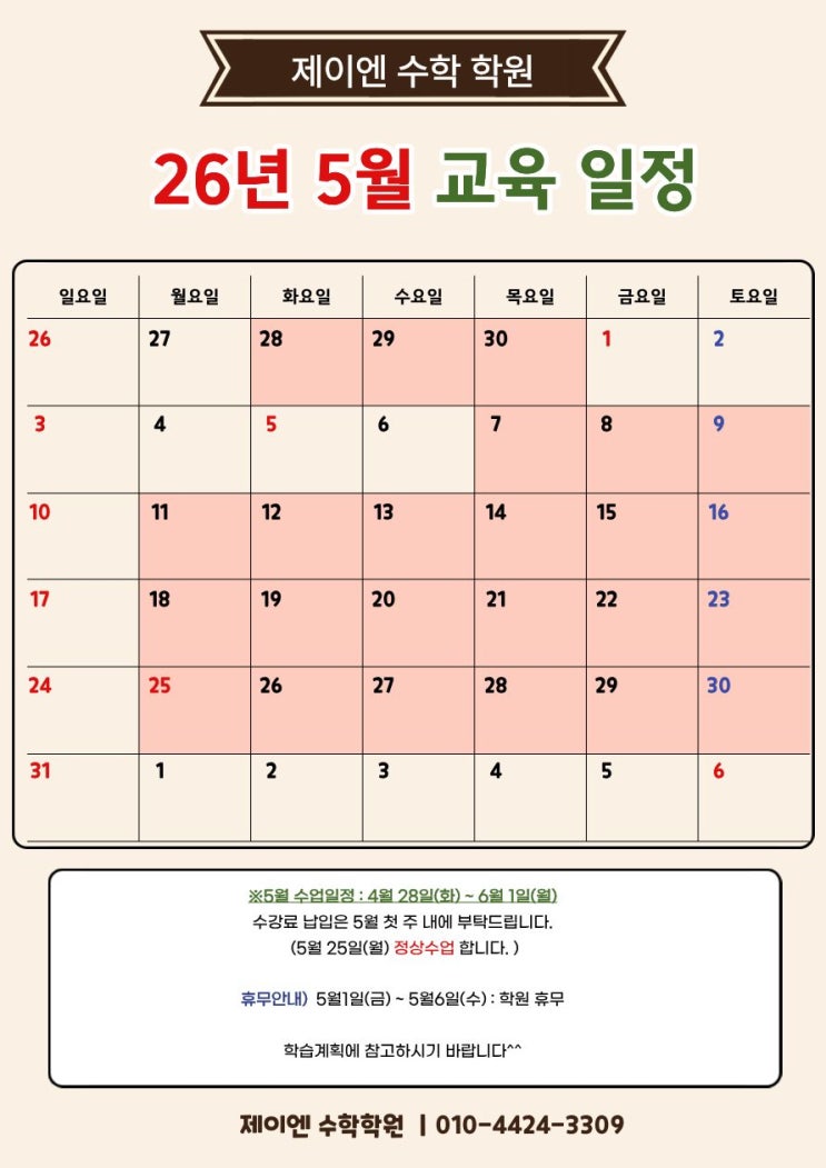 [구미 구평동 수학학원|제이엔 수학 학원] 26년 4월&5월 교육 일정