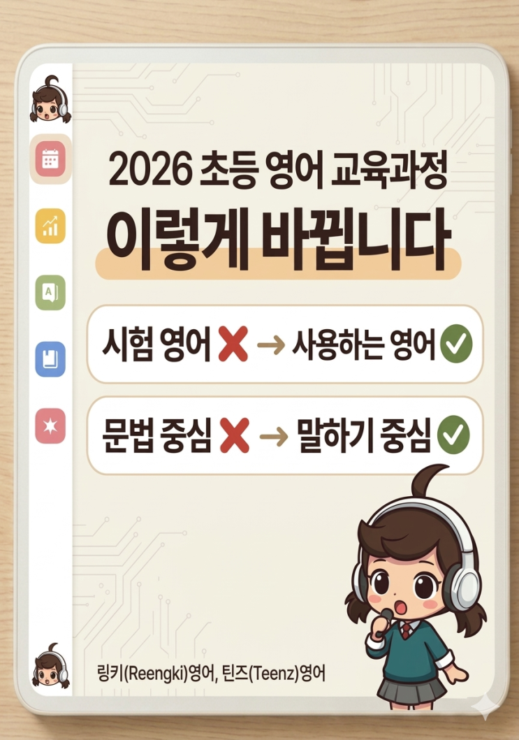 안녕하세요! 링키(ReengKi)영어 & 틴즈(Teenz)영어 도량롯데캐슬점 Lily 입니다. 최근 교육계의 가장 뜨거운 화두는 단연 '2026 초등 영어 교육과정 개편'이죠. 우리 아이들이 학교에서 배우는 영어가 이전과는 완전히 다른 모습으로 바뀐다는 사실, 알고 계셨나요? 이미지 자료와 함께 무엇이 어떻게 바뀌는지 핵심만 콕콕 집어 정리해 드릴게요! 1️⃣ 시험 영어는 NO! 이제는 "사용하는 영어" 예전처럼 단순히 문법 문제를 맞히고 단어를 빽빽하게 외우는 방식은 이제 끝났습니다. 개편되는 교육과정의 핵심은 '실생활에서 얼마나 영어를 잘 활용할 수 있는가'에 맞춰져 있습니다. 문법 중심 ❌ → 말....... <img src="https://blogthumb.pstatic.net/MjAyNjA0MDhfMTQx/MDAxNzc1NjE0OTg0OTQ4.Km4-b6UViwAcgffEaer4r4AFaTIpn9hoK80EjS5kEDAg.BKXP7zx37KRMSzC7jn4-8QG4hO9jclO0f15jI-XASVwg.PNG/1775613615336.png?type=s3" />