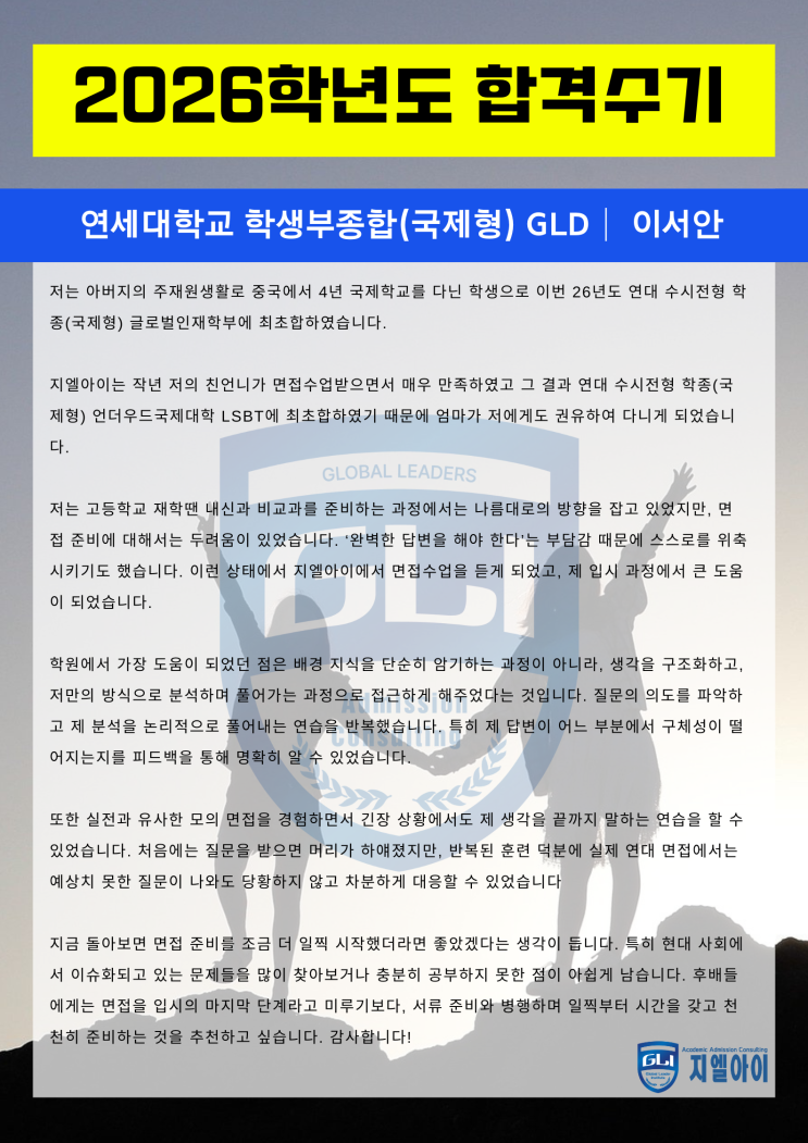 2026학년도 연세대 학생부종합전형(국제형) GLD 합격수기