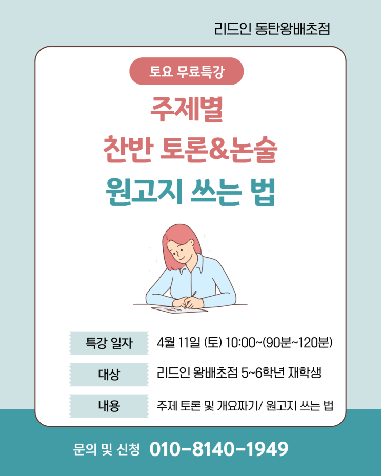 특강 후기_ 주제별 찬반 토론과 원고지 쓰기 특강 안녕하세요! 리드인 동탄 왕배초점, 읽고 쓰고 생각을 담는 쓰담쌤입니다. 지난 주 토요일, 우리 리드인 왕배초점에서 고학년 쓰담이들과 열정적인 토론과 원고지 쓰기 특강이 있었습니다. 그 치열하고 뜨거웠던 현장, 잠시 소개하며 읽기와 쓰기, 그리고 토론 수업에 관한 제 생각도 짧게 나누려고 합니다. 리드인 왕배초점_ 1:1 맞춤 독서 저희 리드인은 같은 학년이라 할지라도 아이마다 각각 다른 교과지수검사를 통해 1:1 맞춤 독서와 쓰기 교육을 진행합니다. 학년별 필독서라는 틀에 아이를 맞추는 것이 아니라, 개인의 독서 수준에 딱 맞는 책을 읽어야만 독서 능력이 실질적으로 성장하....... <img src="https://blogthumb.pstatic.net/MjAyNjA0MTNfMTQy/MDAxNzc2MDcyMzYyNjU0.hty18VIWeXDQHq8lM2hVin-Qni0budCGrxcYQXmSv5cg.iTBDKyxPi5buWCTIMg-faovmtXDXYXTqd5a3wXlALSkg.PNG/%B8%AE%B5%E5%C0%CE_%B5%BF%C5%BA%BF%D5%B9%E8%C3%CA%C1%A1_%286%29.png?type=s3" />