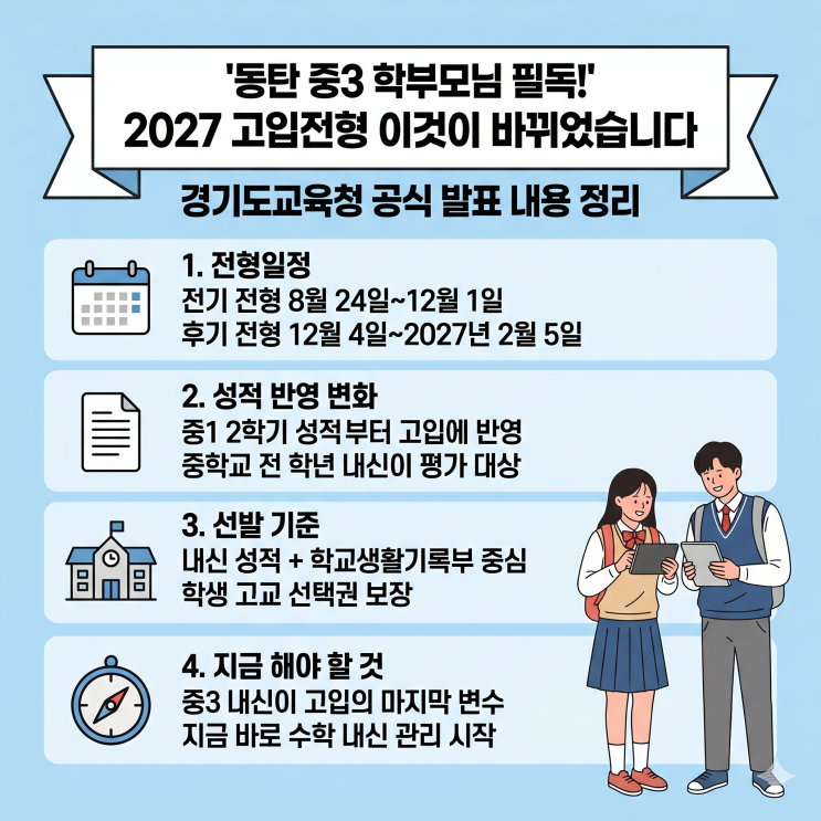 "중3인데 고입 준비, 아직 이른 거 아닌가요?" 이렇게 생각하시는 분들, 지금 이 글을 꼭 읽어보셔야 합니다. 2026년 3월 30일, 경기도교육청이 2027학년도 경기도 고등학교 입학전형 기본계획을 공식 발표했습니다. 현재 동탄내 중3 학생들이 내년에 진학하는 바로 그 전형입니다. 그리고 이번에 중요한 변화가 생겼습니다. 2027 고입전형, 무엇이 달라졌나요? 이번 발표에서 가장 주목해야 할 변화는 하나입니다. 2027학년도부터 중학교 1학년 2학기 내신 성적이 고입 전형에 반영됩니다. 기존에는 자유학기제 이후 성적, 즉 중2부터 본격 반영되는 구조였습니다. 하지만 이제는 중1 2학기 성적까지 평가 범위에 포함됩니다. 이것이....... <img src="https://blogthumb.pstatic.net/MjAyNjA0MTZfMjk1/MDAxNzc2MzE3NTQ2ODUy.-R9TEzI-WhbgPbW37tTiC_xpt9i7NBm0pZvp55Vsme8g.9EPkDv-mCUaHsogYWlC7GB_1W5rqfh_stXOwmnact0sg.PNG/Gemini_Generated_Image_jaa10wjaa10wjaa1_%281%29.png?type=s3" />
