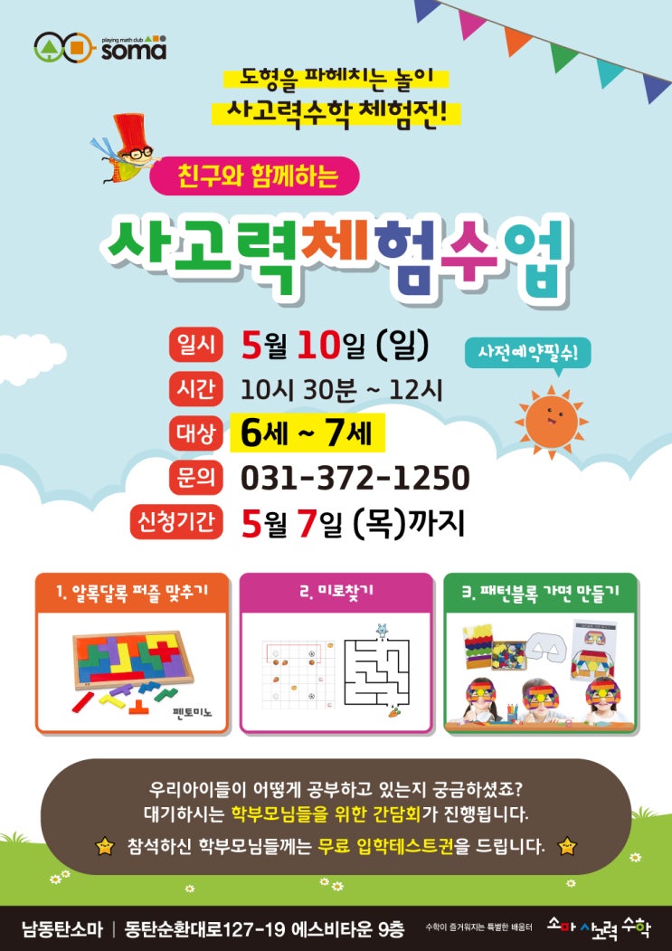 안녕하세요, 남동탄 소마입니다. 26년 6~7세를 위한 소마사고력 수학 체험전이 5월 10일 일요일 오전 10시 30분 ~ 낮 12시까지 진행됩니다. (실제 체험진행시간은 1시간 정도 예상됩니다.) 그동안, 소마사고력 수학 체험문의가 있었으나, 재원생의 안정적인 학습분위기를 위하여 죄송스럽게도 상시로 체험수업을 제공드리지 못했습니다. 이번 사고력수학 체험전에서는 우리 아이들이 수학의 재미 성취감을 느낄 수 있도록 6~7세의 눈높이에 맞는 아래의 프로그램으로 진행됩니다. 펜토미노를 이용한 알록달록 퍼즐 맞추기 미로찾기 Mission Game 패턴블럭 가면만들기 위의 프로그램들은 아이들의 안전과 한명 한명의 양질의 체험을 위해 인원을 각....... <img src="https://blogthumb.pstatic.net/MjAyNjA0MTNfMjI3/MDAxNzc2MDM4Mzk5Mzk2.epcYeKqjYexgsQ48PQDyaY_TbywLLnrdDcZz4dgdQkcg.s5-n5AOG_VznR6-bUaDUTDunXy_wniFZ7RkHOCcdVdgg.JPEG/260410_FC%BB%E7%BE%F7%BA%CE_%B3%B2%B5%BF%C5%BA%BC%D2%B8%B6_%BB%E7%B0%ED%B7%C2%C3%BC%C7%E8%BC%F6%BE%F7_%B8%F0%B9%D9%C0%CF%C3%CA%B4%EB%C0%E5.jpg?type=s3" />