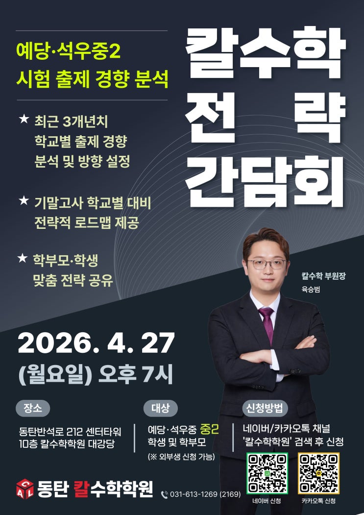 안녕하세요 동탄 반송동 수학학원 칼수학입니다. 중학교 2학년 학생들이 첫 시험을 마친 지금, 단순한 성적 확인을 넘어 앞으로의 학습 방향을 어떻게 잡느냐가 매우 중요한 시기입니다. 이에 따라 예당중ㆍ석우중 학생들과 학부모님을 대상으로 출제 경향 분석 및 기말고사 전략 간담회를 진행합니다. 일정 안내 일시: 4월 27일(월) 오후 7시 장소: 동탄반석로 212, 10층 칼수학학원 대강당 대상: 예당중·석우중 중2 학생 및 학부모 (※외부생 신청 가능O) ☎신청방법: [학교/학년/이름] 형식에 맞춰 신청 부탁드립니다!! 사전예약은 '필수'임을 다시 한번 안내드립니다. 아래 네이버 톡톡 또는 카카오톡으로 예약 신청 부탁드립....... <img src="https://blogthumb.pstatic.net/MjAyNjA0MjFfMjIg/MDAxNzc2NzcyMDM0MTIy.9N0ZUBTi2rT5u1m46zCh1sAr4gHm_zOOBxw7vD3Abugg.DnFm6VESlklyMZexFa1Il6DjM5Z0Jptv_68bbKen4Lsg.JPEG/%C1%A6%B8%F1%C0%BB_%C0%D4%B7%C2%C7%D8%C1%D6%BC%BC%BF%E4._%2891%29.jpg?type=s3" />