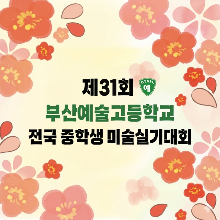 안녕하세요! 부산 미술 입시의 중심, 허브미술학원입니다. 예고 입시를 준비하는 중학생 친구들이 손꼽아 기다려온 소식이 드디어 도착했습니다. 바로 제31회 부산예술고등학교 전국 중학생 미술실기대회 요강이 발표되었는데요! 부산예고는 매년 높은 수준의 실기대회를 통해 원석 같은 인재들을 발굴해왔습니다. 특히 올해는 'BTS 지민 장학금' 이라는 특별한 특전까지 있어 더욱 뜨거운 열기가 예상됩니다. 우리 허브미술학원 학생들도 그동안 갈고닦은 실력을 마음껏 펼칠 기회인데요, 핵심 내용을 꼼꼼히 정리해 드릴게요! ■ 대회 개요 일시: 2026년 5월 9일 (토) 9시~ 13시 장소: 부산예술고등학교 교정 및 지정 고사장 참가 자....... <img src="https://blogthumb.pstatic.net/MjAyNjA0MDdfMjk2/MDAxNzc1NTQzMDg3NzI1.fNUjK6dmJqRx9968OYbQZs74wTYEwVZCXaU5uX8WS9Ag.nE48XRW8Y0I4G1JBjmu3V7hWtkWMeRb18SofdlBXf3Eg.PNG/900%A3%DF1775543065058.png?type=s3" />