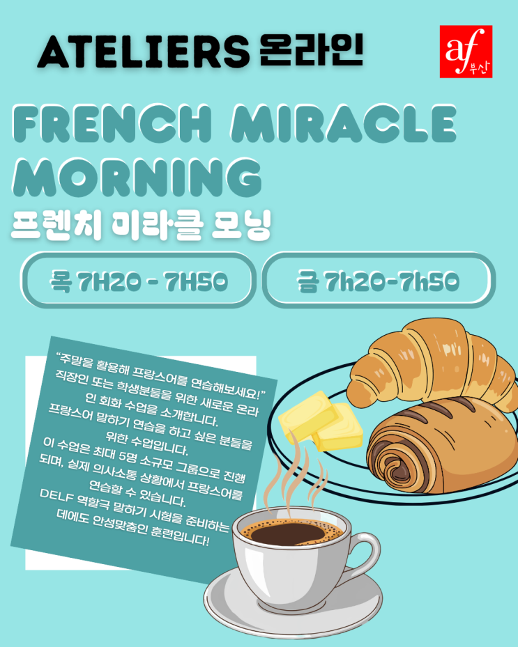 안녕하세요, 부산 알리앙스프랑세즈에서 5월 온라인 강좌를 소개합니다. ✨ French Miracle Morning - 프렌치 미라클 모닝 ✨ 아침 일찍 프랑스어를 연습해보세요! 프렌치 미라클 모닝 온라인 수업은 일찍 일어나는 분들을 위한 강좌입니다. ☀️ 수업 일정: • A2 레벨: 매주 목요일 오전 7시 20분 ~ 7시 50분 • B1 레벨: 매주 금요일 오전 7시 20분 ~ 7시 50분 소규모 그룹으로 진행되며, 실제 의사소통 상황에서 프랑스어를 연습할 수 있습니다. 더 자세한 정보가 필요하시면 언제든지 문의해 주세요! Bonjour, L'Alliance Française de Busan vous propose un nouvel atelier ✨French miracle morning ✨ Pratiquer votre f....... <img src="https://blogthumb.pstatic.net/MjAyNjA0MThfMTk3/MDAxNzc2NDk3OTU0NzM2.WQBqsEKD1YQ79muXsYSVQzpGmZj1d2WWcz8PrZxx_Oog.zN6CU8GWyT2e3aklG_2dN9-dM-EM_oly-ApzXrzIOrkg.PNG/Visuel_de_cours_%284%29.png?type=s3" />