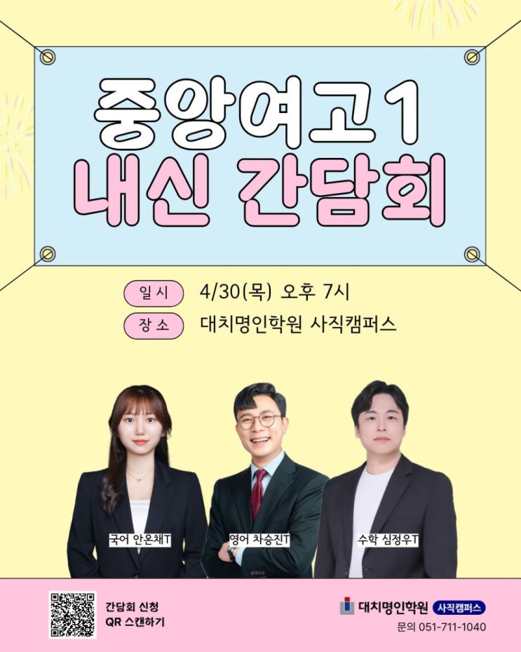 중앙여고1 내신 간담회 일시 : 4/30(목) 오후 7시 장소 : 대치명인학원 사직캠퍼스 ☞간담회 신청 https://sajik.myunginedu.co.kr/branch/brief_detail.php?a_serial=4681&on_off=%EC%98%A4%ED%94%84%EB%9D%BC%EC%9D%B8 문의 051-711-1040 대치명인학원 사직캠퍼스 <img src="https://blogthumb.pstatic.net/MjAyNjA0MjRfMTY2/MDAxNzc3MDMxNDQyMDA5.1gJqkbyMuBQa3DZ4N7n_vOjmFNVds0gRP10WeJaQQGkg.EbletdNF3wCfoX4BEkPUcNOvo4u0Ogwqj5SIyfB3m80g.JPEG/h_8jdUd018svcawuzng917t4q_ce0vjw.jpg?type=s3" />