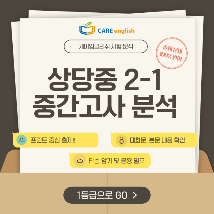 안녕하세요, 케어 잉글리쉬입니다. 내신 시험 준비하느라 모두 수고 많으셨습니다!! 이번 상당중 2학년 영어 시험은 프린트 중심 출제, 대화문·본문 내용 이해 확인, 단순 암기 + 응용 능력 요구 이 세 가지 특징이 핵심이었던 시험이었습니다. 출제 유형 분석 이번 시험은 객관식 22문항, 주관식 7문항으로 구성되었습니다. 객관식에서는 본문 내용 확인, 대화문 이해, 어휘 및 문법 판단, 문장 빈칸 완성 등의 유형이 출제되었고, 주관식에서는 본문 및 대화문 이해, 문장 완성 및 해석, 5형식 문장 영작 등이 포함되었습니다. 전반적으로 다양한 유형이 고르게 출제되었으며, 단순 암기에 더불어 전체 흐름을 이해하고 적용하는 능력이 중요했....... <img src="https://blogthumb.pstatic.net/MjAyNjA0MjZfMjg0/MDAxNzc3MTk0NDMzMTA2.iK7RWhfwX5QbajIhgw2LY_bVsSK1aXOjstoKSPHfNd8g.Eh2wq2VtMafBIqgjwmSf0-zN84wUn7HdSLOS6W_06YAg.PNG/1.png?type=s3" />
