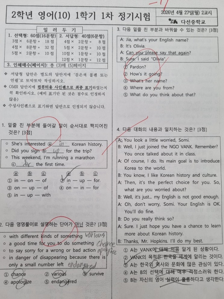 ☆●26' 다선중2 1학기 중간[영어]!●☆