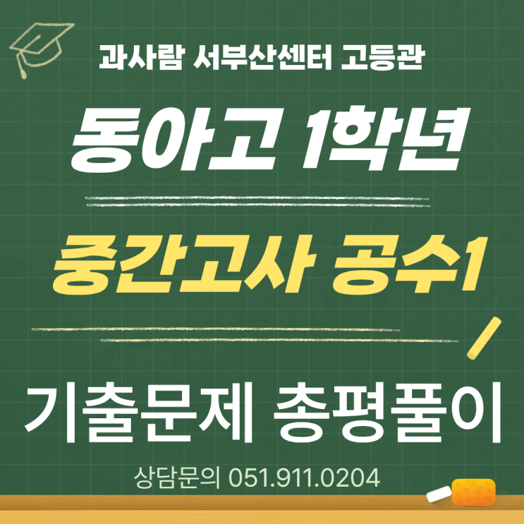 대입몰입학원 제 3915호 안녕하세요 과사람 서부산센터 고등관 수학과 입니다! 오늘 동아고 1학년, 2학년의 중간고사 수학 시험을 1차적으로 치루었는데요, 과사람 서부산센터에 재원중인 동아고 학생들은 전반적으로 점수를 잘 받은 듯 합니다! 동아고는 인근 학교 중 시험 출제경향이 일정하고 참고할 만한 문제가 많이 출제된다고 생각합니다 동아고 1학년 중간고사 공통수학1 총평 객관식 18문제, 서논술형 5문제로 출제되었습니다 동아고는 순차적으로 난이도가 높아지는 편이며 이 문제는 이차방정식의 근과 계수의 관계를 물어보는 간단한 문제네요. 수업 시간에 강조했던 복소수 파트 부분의 z 조건 문제이죠! 제곱이 실수가 되....... <img src="https://blogthumb.pstatic.net/MjAyNjA0MjhfNTUg/MDAxNzc3MzYwMjg0Njg1.QxeMwEZeARNNZlHFwdNaaXtMArC30xBM1OGTlO8jrXog.DFek5goczaFGtWNwItC06KbwDguogdG6rMCbn7JqmX4g.PNG/%C1%A6%B8%F1%C0%BB_%C0%D4%B7%C2%C7%D8%C1%D6%BC%BC%BF%E4._%2865%29.png?type=s3" />