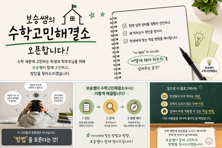 [보승쌤의 수학고민해결소 오픈합니다!] 안녕하세요, 아이들의 곁에서 함께 걷는 보승쌤입니다. 수학을 가르치다 보면 이런 이야기를 정말 많이 듣습니다. “우리 아이는 열심히 하는데 성적이 안 올라요.” “개념은 아는 것 같은데 문제를 못 풀어요.” “어디서부터 잘못된 건지 모르겠어요.” 사실 이 고민들의 공통점은 하나입니다. ‘방법’을 모른다는 것입니다. 그래서 단순히 문제를 더 많이 풀거나, 학원을 옮기는 것으로는 해결이 안 되는 경우가 많습니다. 그래서 고민 끝에 대구 수성구 범어동에서 아이들의 수학 동행을 돕고 있는 보승쌤이 수학으로 힘들어하는 학생과 학부모님들에게 도움드리고자 시작했습니다. ‘보승쌤의....... <img src="https://blogthumb.pstatic.net/MjAyNjA0MjFfNzMg/MDAxNzc2NzU5Mzc0NzYx.t2PYnVeNUzCH5UM2gDyuIBUwoWpkj7SSGcejTMDqy-Mg.lqm-GsJoiVwoR1CkLZ4NQfhfIMmaU0nt63fkHb5qUc8g.PNG/20260421_171557.png?type=s3" />