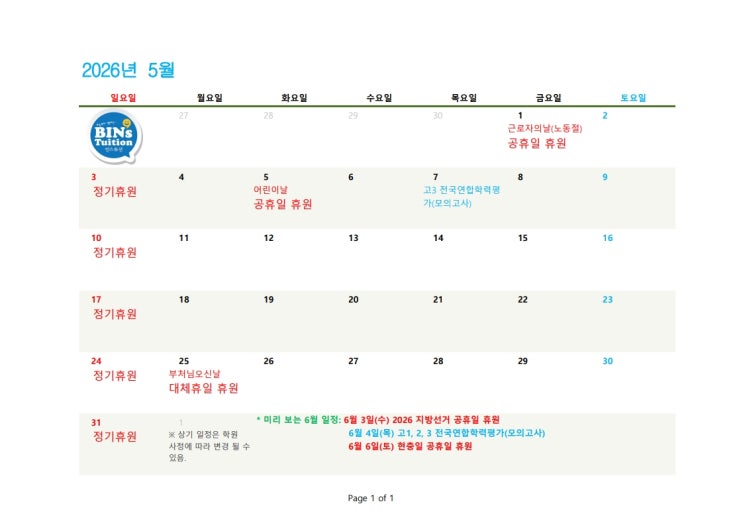 안녕하세요. 빈스튜션(BIN's Tuition)입니다.^^ 2026년 5월 일정 안내 드립니다. - 5월 일정 - * 5월 1일(금) 근로자의날(노동절) 공휴일 휴원 * 5월 5일(화) 어린이날 공휴일 휴원 * 5월 7일(목) 고3 전국연합학력평가(모의고사) * 5월 25일(월) 부처님오신날 대체휴일 휴원 - 미리보는 6월 일정 - * 6월 3일(수) 2026 지방선거 공휴일 휴원 * 6월 4일(목) 고1, 2, 3 전국연합학력평가(모의고사) * 6월 6일(토) 현충일 공휴일 휴원 2026년 1학기 중간고사가 종료되었습니다. 모든 빈스튜션 학생 및 학부모님에게, 열심히 노력하여 끝까지 최선을 다하는 모습에 감사합니다. 빈스튜션은 항상 최선을 다할 것을 약속드리며, '5월 가정의....... <img src="https://blogthumb.pstatic.net/MjAyNjA0MzBfMTgg/MDAxNzc3NTI2ODUyMDA2.BT0F2BSMO5UNoHarI6pYom9yrJ07gk7wFls-bFJICBsg.YF1Y1GijAaOb696lSxGqZFfSX30ADIuciZAyu6862XYg.JPEG/2026%B3%E2_%BA%F3%BD%BA%C6%A9%BC%C7%28BIN%27s_Tuition%29_5%BF%F9%C0%CF%C1%A4.jpeg?type=s3" />