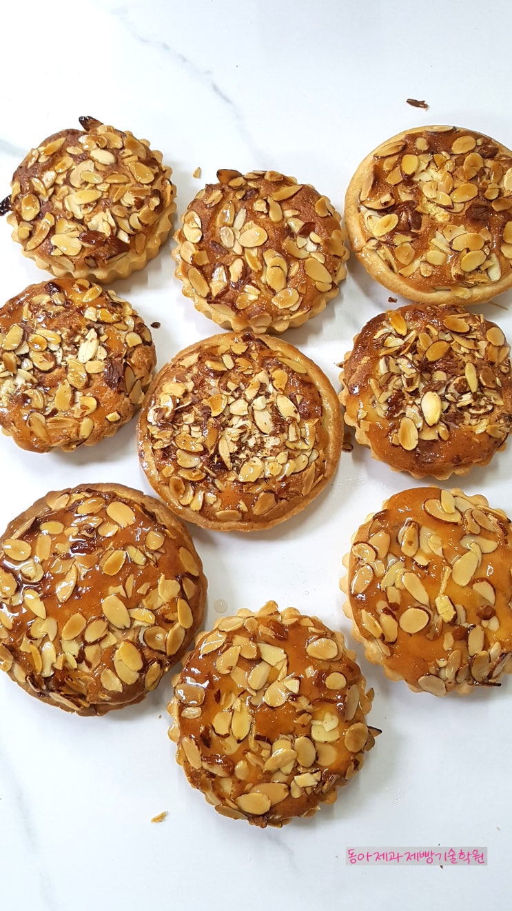 제과기능사자격증과정 학생분들이 만든 타르트 - 충전물 * 광택제 및 토핑 타르트를 제조하여 제출하시오 1) 배합표의 반죽용 재료를 계량하여 재료별로 진열하시오(5분) (충전물·토핑 등의 재료는 휴지시간을 활용하시오) 2) 반죽은 크림법으로 제조하시오 3) 반죽온도는 20℃를 표준으로 하시오 4) 반죽은 냉장고에서 20~30분 정도 휴지하시오 5) 두께 3mm정도로 밀어펴서 팬에 맞게 성형하시오 6) 아몬드크림을 제조해서 팬(∅10~12cm) 용적의 60~70%정도 충전하시오 7) 아몬드슬라이스를 윗면에 고르게 장식하시오 8) 8개를 성형하시오 9) 광택제로 제품을 완성하시오 타르트, 제과기능사, 제과자격증, 제빵기능사, 제과제빵자격증, 동아제과....... <img src="https://blogthumb.pstatic.net/MjAyNjA0MjhfNzYg/MDAxNzc3MzUxNTQ1OTg3.C8qv07YHOAknyioY902s6Pl4Ps20tNPciZg8Q6lWUuYg.gkF3CQLNGd1MJK32Xbiy0hVCCHEHrnZrm7sc1j89xrwg.JPEG/20260428_124910.jpg?type=s3" />