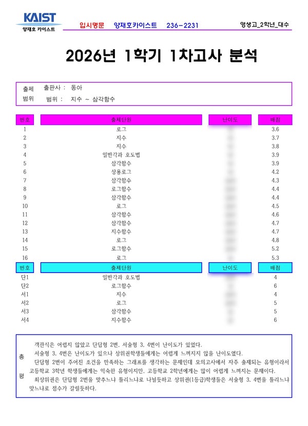 영생고 2학년 1학기 1차고사 대수분석 전주 중★고등 입시수학의 표본인 전주 수학학원 양재호카이스트학원입니다. 이번에는 전주 영생고 2학년의 대수, 2026년 1학기 1차고사를 분석하여 보겠습니다. 위의 내용 중 난이도는 양재호카이스트학원의 내부자료입니다. 그런 이유로 블로그에서는 모두 공개할 수 없음을 양해바랍니다. 학원에 내원하시면 열람가능합니다. ^^ 중화산동 수학학원 양재호카이스트학원에서는 전주에 있는 중★고등학교의 기출을 항상 분석하고 기록으로 남기고 있습니다. 아직 시험을 보지 않은 학생들에게는 좋은 자료가 되고 또한 내년, 내후년에 후배들에게는 많은 도움이 되기도 해서입니다. 그리고 시험직전에 시중....... <img src="https://blogthumb.pstatic.net/MjAyNjA0MjlfMjk0/MDAxNzc3NDU2NTk3MjA3.BbUveIIOwgOdSk8riIvWPnp04qu_ufkbyECZUWJNd4wg.XxprrShnLYSUDQuoWJVxZRJM4FjgQlOOaRvixrhRcv8g.JPEG/2026_1%C7%D0%B1%E2%C1%DF%B0%A3%B0%ED%BB%E7_%BF%B5%BB%FD%B0%ED2_%B4%EB%BC%F6.jpg?type=s3" />