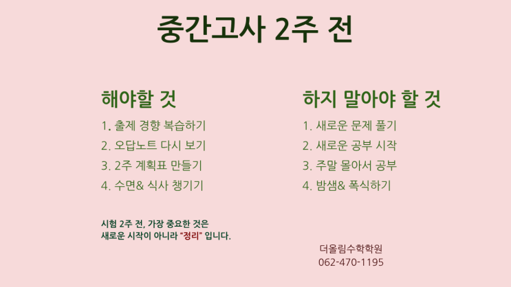 중등 중간고사를 딱 2주 앞둔 시점, 이 시기는 ‘성적이 바뀌는 골든타임’입니다. 지금 무엇을 하느냐에 따라 점수가 10점 이상 차이 나는 경우도 정말 많습니다. 그래서 오늘은 학부모님과 학생 모두가 꼭 알아야 할 **“2주 전 해야 할 것 / 하지 말아야 할 것”**을 명확하게 정리해 드리겠습니다. ✅ 중간고사 2주 전, 반드시 해야 할 것 1. 시험 범위 전체 흐름 정리 이 시기에는 ‘공부량’보다 ‘정리’가 더 중요합니다. 단원별 핵심 개념을 한 번씩 훑으며 “이 단원에서 뭐가 나오는지” “어떤 유형이 자주 출제되는지” 를 구조적으로 정리해야 합니다. 특히 수학은 공식만 외우는 것이 아니라 ✔ 어떤 상황에서 쓰는지 ✔....... <img src="https://blogthumb.pstatic.net/MjAyNjA0MTZfMjEz/MDAxNzc2MzE4OTA1MTE4.UVDajMx5Uaey2q0AkNn2S4Bfs8K73yXR71h2Cfijtjcg.uopLasF8otBQm8t4R-onXQFUC6v1Jr36ok03e8l_Vx8g.PNG/%C1%DF%B0%A3%B0%ED%BB%E7_2%C1%D6%C0%FC_%C7%D8%BE%DF%C7%D2_%B0%CD%B5%E9%2C_%C7%CF%C1%F6%B8%BB%BE%C6%BE%DF_%C7%D2_%B0%CD%B5%E9.png?type=s3" />