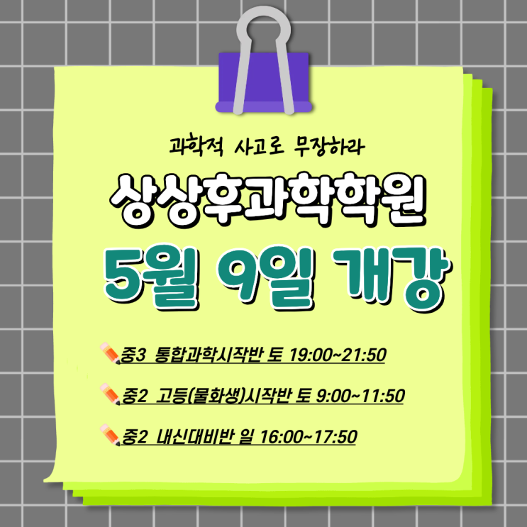과학은 단순히 외우는 과목이 아니라, 개념을 이해하고 연결하면서 사고하는 힘을 키워야 하는 과목입니다. 학생들이 과학을 더 체계적으로 배우고, 학교 내신과 앞으로의 고등 과학까지 자연스럽게 이어갈 수 있도록 학생의 학년과 학습 목적에 맞춰 수업이 진행됩니다. 중3 통합과학 시작반 토요일 19:00~21:50 중2 고등(물·화·생) 시작반 토요일 9:00~11:50 중2 내신 대비반 일요일 16:00~17:50 정규 수업과 함께 주중 클리닉 수업을 운영하여 수업 후 어려웠던 개념을 다시 점검하고 문제풀이 과정에서 막히는 부분까지 꼼꼼하게 보완합니다. 또한 안내된 시간 외 다른 시간표 문의도 가능하며 시간표 배정은 학생 상담 후 학습 수준과 필요....... <img src="https://blogthumb.pstatic.net/MjAyNjA0MTZfMjQy/MDAxNzc2MzQzODYwMTc1.Mvwo4FJkYGHBX4Rpcco6LfQVMP7WXuJxNa-YRf_gc_Qg.p2A2WwbtBbpob_7HM8syEZ9g9YBRdHkXkQgv9p2xwTIg.PNG/%C1%A6%B8%F1%C0%BB_%C0%D4%B7%C2%C7%D8%C1%D6%BC%BC%BF%E4._%281%29.png?type=s3" />