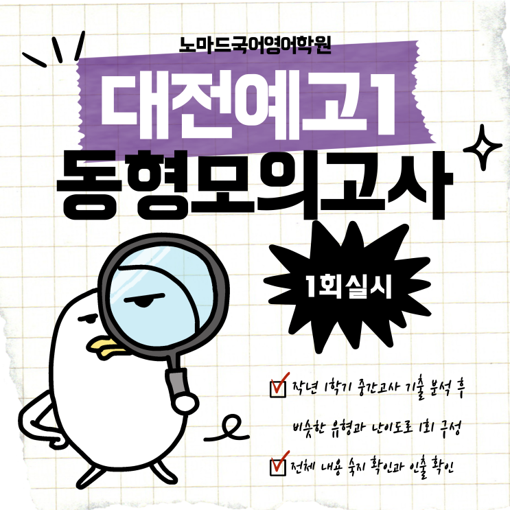 안녕하세요. 노마드국어영어학원입니다. 이제 시험이 2주 앞으로 다가왔습니다. 다들 중간고사 준비 열심히 하고 있나요? 이번 국어 시험의 범위가 너무 적어서 선생님은 너무 걱정이 많은데, 우리 아이들은 이러나 저러나 좋은 날씨마냥 해피해피입니다^^~* 기왕 좋은 기분인 만큼, 기분 좋게 공부해버립시다 ! 동형 모의고사를 열심히 풀고 있는 우리 아이들 ! 시험을 실전처럼 풀기 위해, 모의고사를 실시하기 전, 전체 범위를 공부할 시간을 주고 정확하게 8시 20분 모두 함께 시험을 시작했습니다 ! 첫번째 시험은 작년 시험지의 유형은 그대로, 안의 내용을 변형하여 만든 문제입니다. 작년의 난이도를 최대한 그대로 유지하고자 했습니다....... <img src="https://blogthumb.pstatic.net/MjAyNjA0MTVfMTIg/MDAxNzc2MjQxMDI1NjIw.zLPxtVn4HeYD-PvSgdWRSfLQBQ3Tt3AHptUSNfiNLkEg.wT95Mwbpb-6Wqt1PCzyX7nW5jj91CUliLyfsdwqmKnog.PNG/%C1%A6%B8%F1%C0%BB_%C0%D4%B7%C2%C7%D8%C1%D6%BC%BC%BF%E4.-_%BA%B9%BB%E7%BA%BB_%288%29.png?type=s3" />