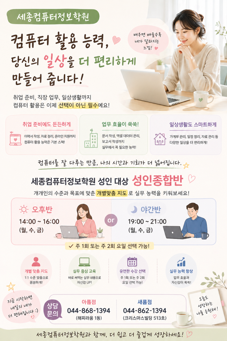 안녕하세요~ 세종시 IT전문교육기관 세종컴퓨터정보학원입니다^^ 취업 준비부터 직장 업무, 그리고 스마트한 일상생활까지! 이제 컴퓨터 활용 능력은 우리 삶에서 뗄 수 없는 필수 역량이 되었습니다. "컴퓨터를 배우고 싶지만 기초가 없어서 고민이에요." "바쁜 직장 생활 중에 효율적으로 배우고 싶어요." 이런 고민을 가진 성인분들을 위해, 세종컴퓨터정보학원에서 개개인의 수준과 목적에 딱 맞춘 '성인종합반'을 운영합니다. 수강생마다 다른 현재 수준과 목표에 맞춰 1:1 수준별 맞춤 교육을 진행하며, 모르는 부분은 꼼꼼하게 짚고 넘어갈 수 있습니다. 자격증 취득은 물론, 실무에서 바로 써먹을 수 있는....... <img src="https://blogthumb.pstatic.net/MjAyNjA0MjhfNCAg/MDAxNzc3MzQxMzUxMTUz.pyb4RaNKVF95YFNd8iGpLyfXqvO7WB10PX_51mv8lAQg.om87-OCJN1r0arghwTMVTYkKA7Eiy9PivTtwlZ5HXWUg.PNG/%BC%BA%C0%CE_%2814%29.png?type=s3" />