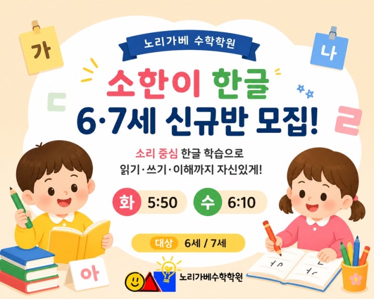 노리가베 수학학원 ✨ 소한이 한글 6·7세 신규반 모집 안내 안녕하세요 노리가베 수학학원입니다. 요즘 한글을 처음 시작하는 시기의 아이들에게 “어떻게 쉽고 재미있게 한글을 익히게 할 수 있을까?” 고민 많으시죠? 노리가베에서 진행하는 ‘소한이 한글’은 단순 암기가 아닌, 소리(음가) 중심 학습을 통해 읽기 → 쓰기 → 이해까지 자연스럽게 연결되는 한글 프로그램입니다. 아이들이 부담 없이 놀이처럼 접근하면서 스스로 읽고 싶은 마음을 키우고, 기초 문해력까지 탄탄하게 잡아주는 것이 특징이에요 --- 모집 대상 ✔ 6세,7세 수업 시간 ✔ 화요일 5:50 ✔ 수요일 6:10 --- 한글은 처음 시작이....... <img src="https://blogthumb.pstatic.net/MjAyNjA0MjlfMTIy/MDAxNzc3NDIwOTc1MTY4.aT3edq-I5pW0Xz5hl5Chju9V_X8d7PPOJVIBqAIX-60g.aQWTSa4NhGbA427-qdDo6iK8HT2qmCtNzX2m1omzcwAg.JPEG/E679A9EA%A3%AD36C5%A3%AD4D19%A3%AD970C%A3%AD3007FFA64545.jpg?type=s3" />