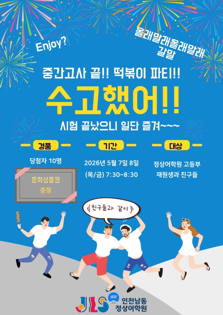 5월 정상 (영수) 고등부 이벤트 중간고사 끝! 수고했어! 떡볶이 파티 중간고사 준비하느라 정말 고생 많았습니다. 열심히 달려온 우리 고등부 친구들을 위해, 시험이 끝난 기념으로 떡볶이 파티 이벤트를 진행합니다! ※이벤트 안내※ 일정: 5월 7일(목), 8일(금) 시간: 오후 7:30 ~ 8:30 장소: 학원 내 대상: 고등부 전원 참여 가능, 재원생 친구들 ※이벤트 내용※ 시험 끝난 기념으로 맛있는 떡볶이를 함께 먹으며, 그동안 쌓인 스트레스도 날리고 즐거운 시간을 보내려 합니다. 열심히 공부한 만큼, 맛있게 즐기고 재충전하는 시간이 되길 바랍니다. ※추가 혜택※ 친구와 함께 오면 간식 추가 제공 등록 시 문화상품권 제공 ♥많....... <img src="https://blogthumb.pstatic.net/MjAyNjA0MjJfNzgg/MDAxNzc2ODI3Nzk5MjUw.t9hUxsCoyA-fCk4iL8N3-P9Pn5EzOhAYyd_FiX6WUmwg.4CzXYZsxUr-sAa9UnU3qcm2h2xB4KjkLLv9hCRwQgH4g.JPEG/%B0%ED%B5%EE%BA%CE%B6%B1%BA%BA%C0%CC__1.jpg?type=s3" />