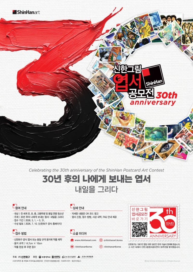 안녕하세요, 덕은동·상암동에서 아이들과 함께 성장하는 미술 이야기를 전해드리는 덕은더함미술학원입니다♡♡ 오늘은 그림을 좋아하는 친구들이라면 한 번쯤 도전해볼 수 있는 공모전 소식을 전해드리려고 합니다 ^^ 바로~~~ 제30회 신한그림엽서공모전 ! ! ! 제30회 신한그림엽서공모전 은 전문 미술재료 기업인 신한화구에서 주최하는 대표적인 청소년 미술 공모전으로, 1997년부터 시작되어 오랜 전통을 이어오고 있습니다. :) 지난 30년 동안 어린이와 청소년의 창의력과 표현력을 응원하며 꾸준히 개최되어 왔으며, 현재는 국내를 넘어 세계 여러 나라의 학생들이 함께 참여하는 글로번 미술 공모전으로 자리 잡았어요. 덕은동미술학원 더....... <img src="https://blogthumb.pstatic.net/MjAyNjA0MjRfMTQ5/MDAxNzc3MDEzNDQ3ODIx.Po_UPAthvf7nIwNPtEjIAHVlYDEIoeYqTVJKdMPjQ80g.akvuwqvBJGsCh0_KpSKr3SPibpvbHTa-JLH52i1Y9rcg.JPEG/17761405480.jpg?type=s3" />