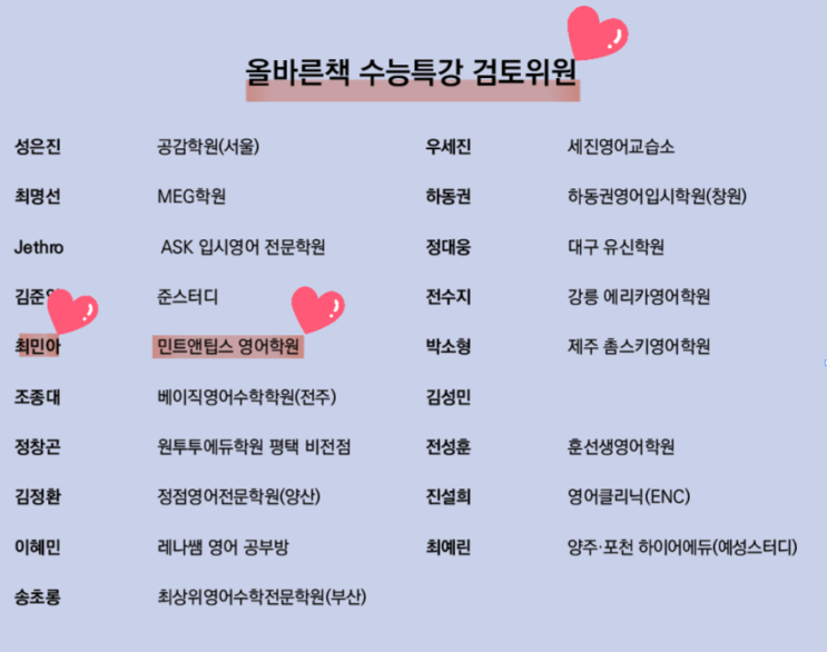 안녕하세요. 민트앤팁스 Mina tr. 입니다. 오늘은 올바른책 수능특강 영어 분석노트&변형문제 수능특강 라이트 영어독해 분석노트 검토위원으로 선정된 소식을 들고왔어요~~ 지난 1월 발간된 2027년 수능 대비 수능특강 교재 출판과 동시에 민트앤팁스 고등부 학생들도 숨가쁘게 수특 공부를 하고 있는데요! 특히 올 해 신원고3 영독작 시험범위 교재로 수특 영어/영독 중 무슨 교재가 쓰일지 방학동안 눈치싸움을 했는데 다행히 학생들 수업을 해 놓았던 교재로 진행되어 뿌듯하네요 더불어, 지난 3월 모의고사 분석노트 검토작업에도 참여하여 1학기 중간고사를 준비하는 4월 중순 현재까지도 숨가쁘게 달려오고 있습니다. 고등학교는 각 학....... <img src="https://blogthumb.pstatic.net/MjAyNjA0MTNfMTQg/MDAxNzc2MDM0MzkzNTY5.YmtJAX1P64iOGiux7Fc3Ss0KJoZZ54CRIWKoEu0gxAMg.Flgxt5VNlGTcJWN0YaAbgeHy4xawULhvWlThbM-urwcg.PNG/1775526281504.png?type=s3" />