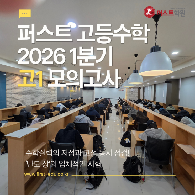 지난 2026년 4월 11일(토), 퍼스트학원 고등부 수학 1분기 모의고사가 실시됐습니다. 고등학교 1학년 재원생 중 총 84.3%가 응시한 이번 시험은 '난도 상'으로 객관식 17문항과 단답형 3문항 그리고 서술형 2문항으로 출제되었습니다. ○시험 일시 : 2026년 4월 11일(토) 오전 9시 ~ 9시 50분 ○시험 범위 및 난이도 : 다항식의 연산~이차함수 최대최소 (난도 상) ○구성 : 객관식 17문항, 단답형 3문항, 서술형 2문항 ○응시인원 : 고1 재원생 중 재원생 84.3% 응시 (병결, 타 학원 일정 등 결시생 제외) ○응시자 총원 평균 : 53.7점 최고점 : 100점(1명) 이번 2026년도 퍼스트학원 고등부 수학 고1 1분기고사는 '수학실력의 저....... <img src="https://blogthumb.pstatic.net/MjAyNjA0MTRfMjY3/MDAxNzc2MTUzMDE4NDg0.sKgZkyBRyNoPmB43zsW3KMLAM7zfbvMPRVq2WzmOcYEg.ayc2s8cLZ17yUjXP-ifZ-2o0I0667MmlNKkebvS7IHwg.PNG/2026_1%BA%D0%B1%E2%BC%F6%C7%D0%B8%F0%C0%C7_%B0%ED1.png?type=s3" />