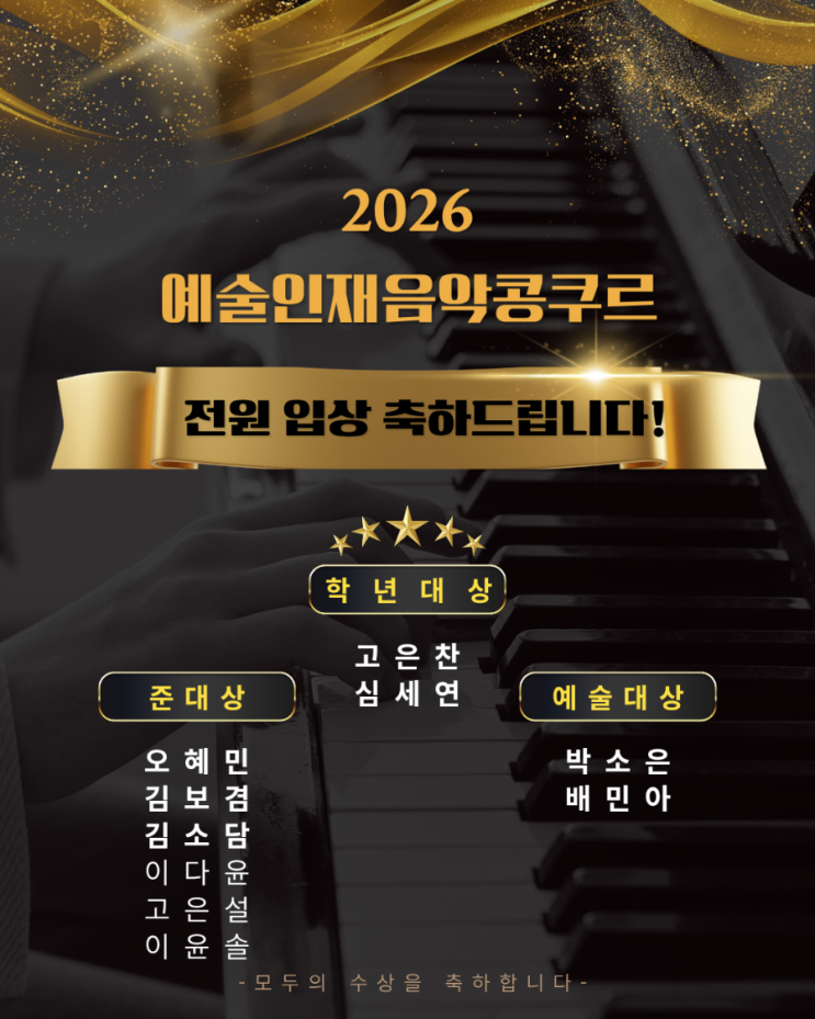 안녕하세요! 오랜만에 블로그에 글을 작성하게 되었네요~ 올해 겨울 2026년 2월 28일 토요일에 있었던 예술인재음악콩쿨에 참여한 11명의 학생들이 전원 입상하여 축하의 소식을 전합니다.♡ 고양시 청소년 수련관에서 개최된 예술인재음악콩쿨! 여러 지역의 많은 학생들과 함께 피아노 실력을 평가받는 자리였는데요~피아노에 열정 넘치는 친구들이 이렇데 많았다니! 한꺼번에 모여서 보니 참 마음이 벅찼답니다. 이번 콩쿨에서도 저희 아이들 열심히 연습해 좋은 결과를 얻었습니다. 1학년, 3학년, 4학년, 중학교1학년 학생들입니다. 2025년 하반기부터 각 학생의 특성을 고려해서 선곡하여, 악보를 같이 읽고 손에 익히며 본격적인 깊은 내용....... <img src="https://blogthumb.pstatic.net/MjAyNjA0MjBfMTg3/MDAxNzc2Njg4ODczODE3.IFNJd9VvI1Q-2236v7qEkDEeCPwl-qXKuxNX2-j-kSog.2zwPtHhag_UBNf-VEdfwjsh9t4xTuDfJfoZZJqPIfQAg.PNG/900%A3%DF1776683571493.png?type=s3" />