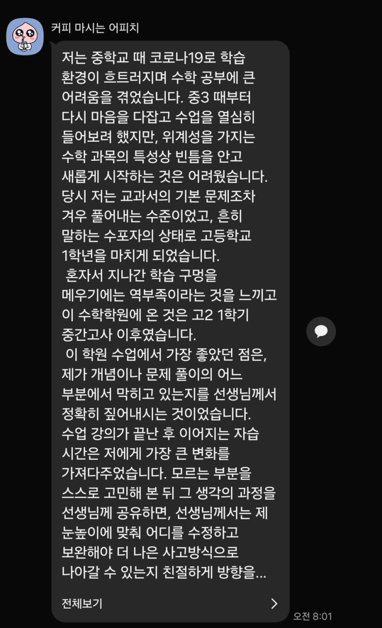 요즘 아이들 수학 공부하는 뒷모습 보고 있으면 참 마음이 복잡할 때가 있죠, 분명 학원도 보내고 문제집도 사주는데, 왜 성적표만 나오면 한숨부터 나오는지... 특히 기초가 부족한 아이들은 "지금 시작해도 소용없어"라며 미리 포기해버리는 모습에 속상하실 때가 많습니다. 사실, 아이가 게을러서가 아닙니다. 수학은 계단식 학문이라 중간에 한 칸만 비어도 다음 단계를 밟을 수가 없거든요. 특히 중학교 시절 코로나로 학습 결손이 생긴 현재 고등학생들은 그 빈틈이 생각보다 깊습니다. 오늘은 실제 작년 고3 수강생이 남겨준 진솔한 후기를 통해, 어떻게 그 깊은 구멍을 메우고 수포자에서 수학과 진학까지 가능했는지 그 비결....... <img src="https://blogthumb.pstatic.net/MjAyNjA0MjFfMjQ4/MDAxNzc2NzgwNjA2OTIx.yF4Jf5SC4pCpxTveOuTf2xfxiCckzgxWbDE1-GziMtog.okulw6HmRM-ua23AeLFOCLkkokmfr29P1O0Vu3aohS4g.JPEG/IMG%A3%DF5274.JPG?type=s3" />
