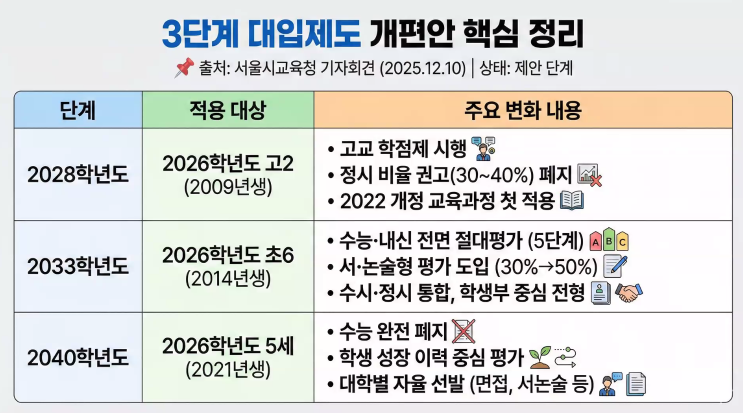 얼마전 3단계 대입제도 개편안이 발표되었습니다.^^ 관련내용 정리해보려고 하니 참고 부탁드리겠습니다. 1단계 : 2028학년도 적용 대상: 2026학년도 고2 (2009년생) 핵심 변화 고교학점제 시행 대학처럼 필요한 과목을 선택해서 학점을 이수하는 방식 학생별 맞춤형 시간표 가능 정시 비율 권고(30~40%) 폐지 현재 대학별 정시 비율을 일정 수준 유지하도록 하던 권고가 없어질 가능성 대학 자율성 확대 2022 개정 교육과정 첫 적용 선택과목 확대 진로 중심 수업 강화 의미 현재 중학생 및 고1 학생들이 가장 직접적으로 영향을 받을 수 있는 단계입니다. 2단계 : 2033학년도 적용 대상: 2026학년도 초6 (2014년생) 핵심 변화 수능·내신 전면 절....... <img src="https://blogthumb.pstatic.net/MjAyNjA0MDZfMjYg/MDAxNzc1NDQyNDI0MzA0.0YC1AlkdZAzc5addJ80UaE63UdQCGSZMIb14Rxw4QK4g.oSyqqVLU8L1nG1PL7_oXiA4UO4-60tRF0VUF8PtuL7Qg.PNG/3%B4%DC%B0%E8_%B4%EB%C0%D4%C1%A6%B5%B5_%B0%B3%C6%ED%BE%C8_%C1%A4%B8%AE.png?type=s3" />