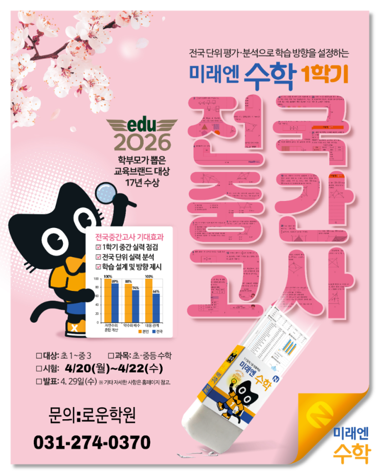 ㆍ #로운학원 #미래엔수학 #전국중간고사 26년 1학기 미래엔전국중간고사 시행 안내 1. 시행요강 1) 대상: 초등 1학년 ~중등 3학년, 수학 2) 기간: 4월20일(월)~4월/22일(수) 3) 문항: 총 25문항(일반형 20문항, 서술형 5문항) 4) 시험시간: 총 50분 ✔️전국/지역 평균 및 현재 학습 위치 ✔️영역/단원별 성취도 ✔️학생 개개인의 강점과 약점 을 분석하여 강사의 감이 아닌 객관적인 자료를 바탕으로 앞으로의 방향성을 결정하고 재계확하기 위한 시험입니다. ※시험 범위 및 응시 대상은 사진 참고 부탁드립니다. ♤수학 재원생: 신청없이 전원 응시 ♤ 4/17((금)까지 신청시 -영어.국어.리드인.과학 재원생도 응시 가능 -로운학원 비재....... <img src="https://blogthumb.pstatic.net/MjAyNjA0MTVfMjE5/MDAxNzc2MjA5MzI2MTM5.6Mckzjc0ALQ0NNoCZVWm5WThbvFfVWv58xSfQSNYm_Ag.fq4RVFJsNvxT5SUmhpXTKcoCYazfrQqeU3-K0JfxccUg.PNG/900_Picsart_26-04-12_10-57-27-514.png?type=s3" />