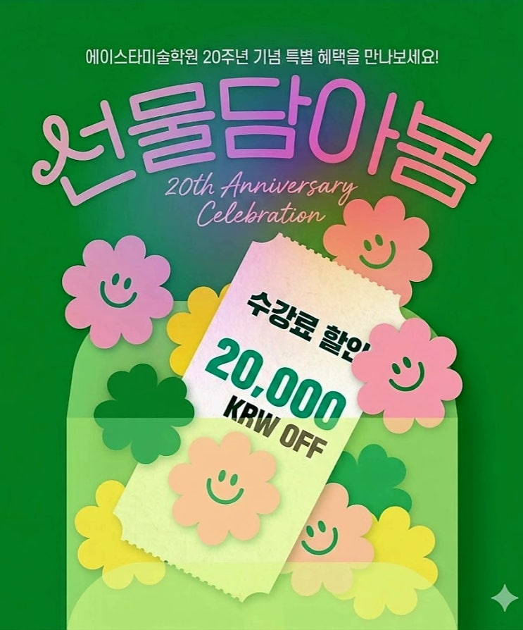 20주년 감사 이벤트 안내 오랜 시간 함께해주신 학부모님과 아이들께 진심으로 감사드립니다. 저희 학원이 어느덧 20주년을 맞이하게 되어, 감사의 마음을 담아 작은 이벤트를 준비했습니다. 기존 재원생 대상으로 5월 한달간 수강료 2만원 할인 혜택을 드립니다. (소개로 등록한 학생도 2만원 할인해드립니다.) 아이들과 함께 쌓아온 시간들이 있었기에 가능한 20년이었습니다. 앞으로도 더 좋은 수업과 성장으로 보답하겠습니다. 항상 믿고 맡겨주셔서 감사합니다 #동백에이스타미술학원 #동백에이스타 #에이스타20주년 <img src="https://blogthumb.pstatic.net/MjAyNjA0MTdfMTYg/MDAxNzc2NDIzNTE3Mjc1.t2qxbYjBOuXt5cLbDa64CuUFKFIrNi88Kp8dN7hgjYUg.VCFTwgdsXZeN-LRDtbHUTnn2aIcyzCAaX34XS01l0gcg.JPEG/%C7%D2%C0%CE20.jpg?type=s3" />