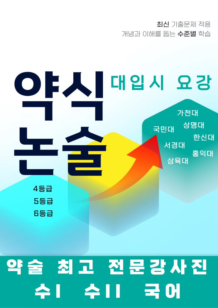 ① 약술논술을 해야 하는 이유 : 내신 4, 5, 6, 7등급 학생들은 서울권이나 경기권의 중위권 이상의 대학에 진학하기가 현실적으로 어려운 현실입니다. 최근 대학 입학 결과에서도 나타나고 있는데요 이에대한 거의 유일한 대안이 바로 약술 논술입니다. ② 약술 논술을 시작해야 하는 시기 : 국민대, 가천대의 경우 고3 올라가는 겨울방학부터 시작하는 것이 좋습니다. 실제 2026학년도 합격을 한 학생들의 경우 국어, 수학 두 과목을 조기에 대비하여 실전 시험장에서의 긴장감과 현장의 작은 방해 요소들을 극복하고 좋은 점수를 거두었답니다. 특히 수능 전 10월에 약술논술을 실시하는 상명대(서울), 서경대(서울), 을지대(경기 메디컬)은 9....... <img src="https://blogthumb.pstatic.net/MjAyNjA0MTZfMTAz/MDAxNzc2MzMxNjcwMTU1.4OL6QuleGAPN07Q-8uLvYjZSRRo8D1Rjo0h6ktC-rHIg.Ukssc32HM513vWL22HsLvjmEi9J4n8zJg1gvvQKfDSMg.PNG/%C1%A6%B8%F1%C0%BB_%C0%D4%B7%C2%C7%D8%C1%D6%BC%BC%BF%E4..png?type=s3" />