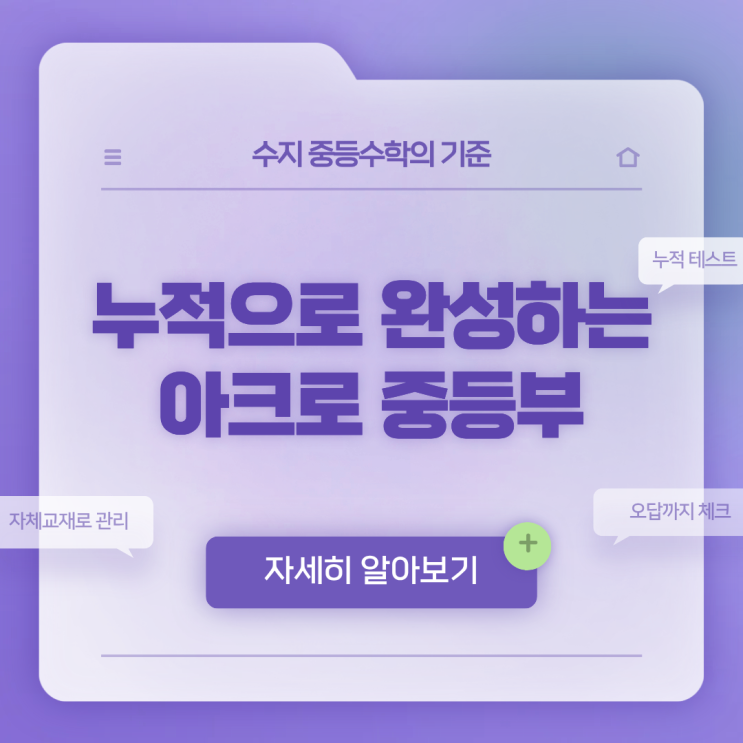 중등 수학은 단순히 진도를 빨리 나가는 것만으로 완성되지 않습니다. 특히 선행을 하는 학생일수록 지금 배우는 내용을 나중에도 다시 꺼내 풀 수 있는지, 이전 단원까지 연결해서 생각할 수 있는지가 훨씬 더 중요합니다. 그래서 아크로 중등부는 단순히 “많이 나간다”에 집중하지 않습니다. 배운 내용을 제대로 남기고, 시험으로 연결되게 만들고, 고등 수학까지 이어질 수 있도록 시스템으로 관리하는 중등 수업을 만들어가고 있습니다. 아크로는 원래 고등부 학원으로 시작했습니다. 그래서 중등 수업도 중등에서 끝나는 공부가 아니라 앞으로의 고등 수학까지 생각하는 기준으로 설계됩니다. 하지만 지금의 아크로 중등부는 그 위에 더 촘....... <img src="https://blogthumb.pstatic.net/MjAyNjA0MTdfNjUg/MDAxNzc2NDIwOTk3OTQy.1mhVqpkxP7UQTzFEWJQZraEwzGzUW1x9sWak68w6Rvsg.eXX8CYLLakuAqK1j8RiMD8T6c6j5LpZ4tiWJEaKqJhgg.PNG/%C1%A6%B8%F1%C0%BB_%C0%D4%B7%C2%C7%D8%C1%D6%BC%BC%BF%E4._%2839%29.png?type=s3" />