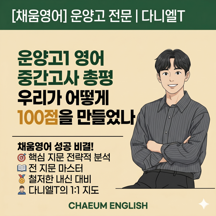 운양고1 첫 영어 내신 쉬웠다고 합니다. 그렇다고 모든 학생이 100점을 맞진 못 했습니다. 하지만.. 저희 채움영어학원 운양고1 학생 평균 93 만점자 비율 50%이라는 결과로 운양고 내신은 다니엘T라는 걸 증명해냈습니다. 어떻게 준비시켰는지 노하우 다 보여드리겠습니다. 중등 내신 vs 고등 내신 — 뭐가 다른가? 분명 운양고1 시험이 쉬운 건 맞습니다. 그렇다고 중학교 영어 시험처럼 교과서 본문을 얼마나 외웠는가로는 부족합니다. 운양고 1학기 중간고사 — 어떤 시험이었나 이번 시험을 분석하면 이렇습니다. 어법이 4문항이었습니다. 13번, 15번, 17번, 22번. 그 중 13번은 4.5점짜리 킬러였습니다. 어법복합형으로 "틀린 것만을....... <img src="https://blogthumb.pstatic.net/MjAyNjA0MjNfMTAg/MDAxNzc2OTQ1NjY4NDcx.f5-_rCF6XMyUZdq1hH5bSOekA2-5Y_FwQiW2-mSntz4g.vRA0Wy0uWROuLtfJI5rSNwUUXm1Uxwmyg7uCKEloXzMg.PNG/Gemini_Generated_Image_bv4byobv4byobv4b.png?type=s3" />