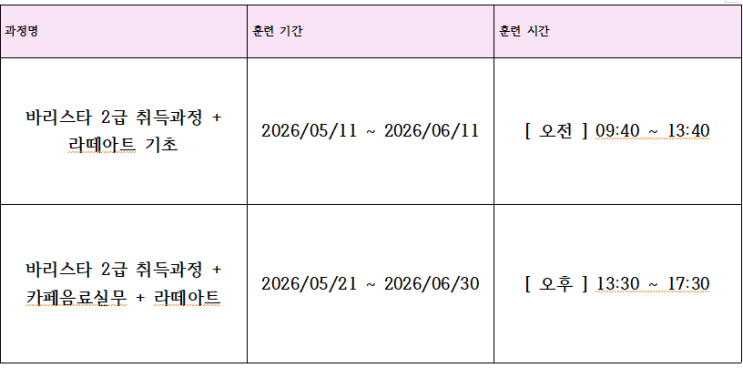 안녕하세요 양주바리스타학원 입니다. 05 월 국비 수업 개강 안내 드립니다 국비 수업 수강신청은 " 고용 24 " 홈페이지에서 가능합니다 . " 고용 24 " 홈페이지에서 " 양주바리스타학원 " 을 검색 후 수강신청 가능 / 상세 시간표 확인 가능 [ 주 횟수 및 요일은 홈페이지에서 원하시는 과정 클릭 후 , 시간표를 확인 해 주시면 됩니다 ^^] 수강신청은 개강 전 미리 신청 해 주셔야 가능합니다 . 이 외 궁금하신 점은 학원 내 상담 해 주시면 더욱 자세한 설명 도와 드리겠습니다 ^^ . 전화 상담 : 010-7668-6209 방문 상담 : #양주바리스타학원 #옥정바리스타학원 #바리스타 #바리스타학원 #국비지원교육 #바리....... <img src="https://blogthumb.pstatic.net/MjAyNjA0MTZfMjA5/MDAxNzc2MzIxOTc1NDI4.toT6oaeS4XJ2vnSnygQ0lKk_p7mhOLhrIejlqquZ_20g.B9QXD_sJ2kiK4X1gmY9VI99yPYsFtuIbO9wMtwBYmWAg.PNG/%C4%B8%C3%B3.PNG?type=s3" />