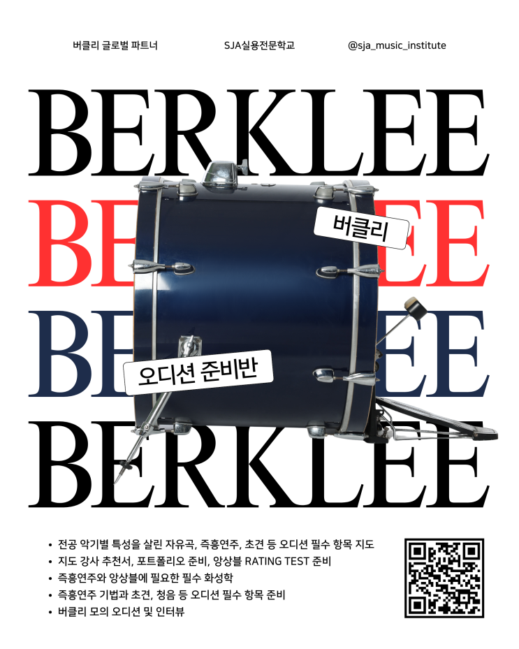 안녕하세요. SJA실용전문학교입니다. 버클리 음대 진학을 꿈꾸고 계신가요? 레슨은 누구나 받을 수 있지만 합격과 장학금이라는 값진 결과는 철저하고 체계적인 준비 과정이 필요합니다. 평균 합격률 80% 이상, 장학생 배출 70% 이상이라는 압도적인 수치로 증명하는 SJA만의 독보적인 버클리 오디션 준비반 커리큘럼을 안내 드립니다! 오직 버클리 오디션 합격에 최적화 된 맞춤형 커리큘럼 * 버클리 입시 전문 강사진의 1:1 코칭 * 악기별 특성을 극대화한 자유곡 준비 * 즉흥연주 준비, 실전 초견 대비 * 포트폴리오 제작 및 앙상블 Rating Test 준비 * 재즈 즉흥 연주 앙상블을 통한 실전 훈련 * 자유곡, 즉흥연주, 청음, 초견 등 오디션 필....... <img src="https://blogthumb.pstatic.net/MjAyNjA0MjRfMjMz/MDAxNzc2OTk0MzE1OTgy.z2_1scbFcD_c1zgeBy1B5pAtGLfYf2HOR28tmZxP0-cg.Dj-5vCCC7viPkrradsNyNeLJAIi7TXKnWutYqRXyqI8g.PNG/2026-04-16_%B9%F6%C5%AC%B8%AE%BF%C0%B5%F0%BC%C7_%C1%D8%BA%F1%B9%DD_%C8%AB%BA%B8_%B5%F0%C0%DA%C0%CE.png?type=s3" />