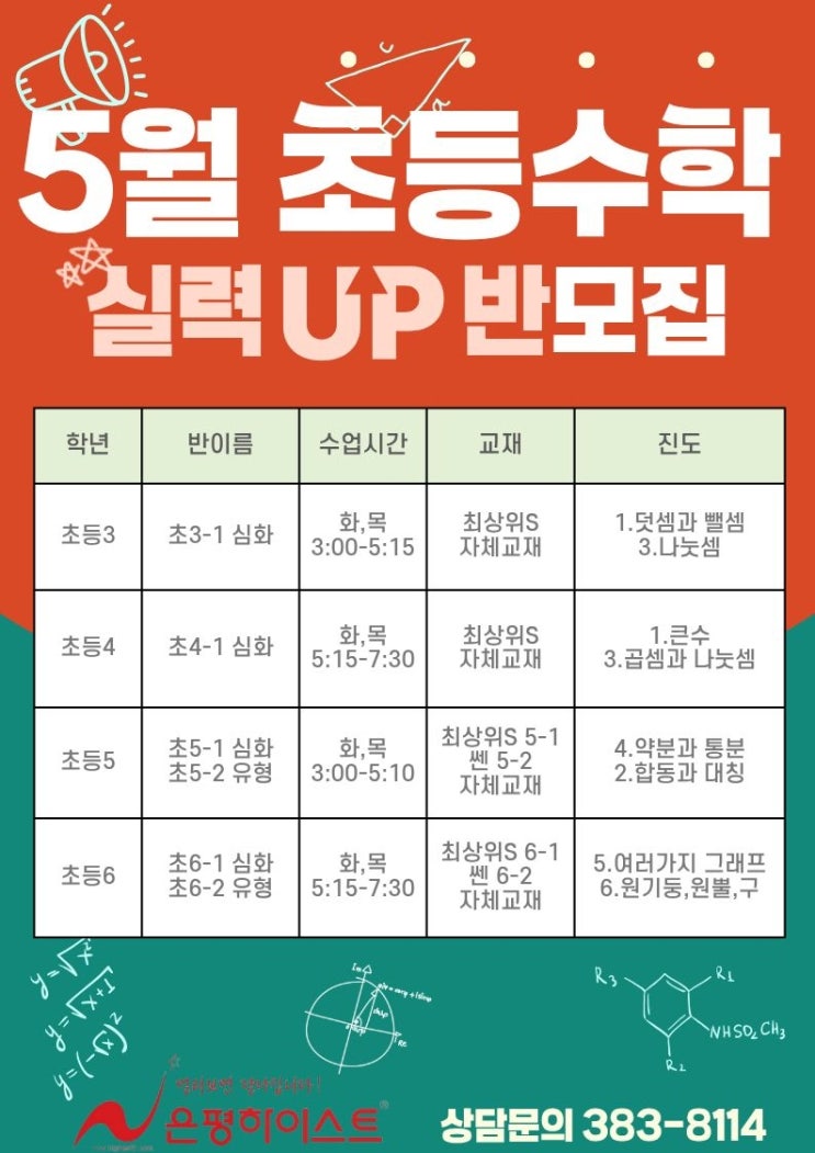 <<5월 초등수학 안내입니다>> 하이스트 수학은 철저한 개념 설명 및 이해를 토대로 문제풀이를 하며 기본 개념 - 유형 - 응용 - 심화 단계를 거쳐 학생들이 어떤 문제가 나와도 생각해서 풀이할 수 있게 지도합니다, 입학하는 학생들은 테스트후 체계적인 상담과 함께 선생님과 상의후 진도 조절을 맞추고 있습니다. .대상 : 초3 .시간 : 화/목 3:00-5:15 .교재 : 최상위S, 하이스트 자체교재 .진도 : 1.덧셈과 뺄셈. 3.나눗셈 .대상 : 초4 .시간 : 화/목 5:15-7:30 교재 : 최상위S, 하이스트 자체교재 .진도 : 1.큰수, 3.나눗셈 .대상 : 초5 .시간 : 화/목 3:00-5:15 .교재 :최상위S 5-1, 쎈 5-2, 하이스트 자체교재 .진도 : 4.약분....... <img src="https://blogthumb.pstatic.net/MjAyNjA0MjBfMTQ4/MDAxNzc2NjY5MDI4NzM5.AQ7ksFYj13w040ACSVZhAipOc7eQiMNJezZcBjWwdFog.DFEsM4nrjuTE2HQnLIfrVsvw-04UVBNh4gYHt4ZLvVUg.JPEG/5%BF%F9%BC%F6%C7%D0.jpg?type=s3" />