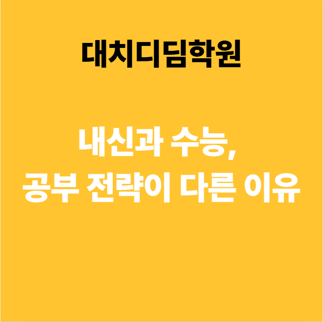 안녕하세요. 대치동입시학원 대치디딤학원입니다. 중학생에서 고등학생으로 올라가면서 많은 학생들이 혼란스러워하는 부분 중 하나가 바로 내신과 수능 공부를 어떻게 나눠서 해야 하는가입니다. 두 시험 모두 중요한 것은 맞지만, 실제로는 요구하는 능력과 평가 방식이 다르기 때문에 같은 방법으로 공부해서는 원하는 결과를 얻기 어렵습니다. 그렇다면 왜 내신과 수능은 공부 전략이 달라야 할까요? 먼저 내신 시험은 학교 수업을 기반으로 한 시험입니다. 교과서, 프린트, 선생님의 설명, 그리고 학교에서 강조한 내용이 시험 문제로 출제되는 경우가 많습니다. 즉, 내신은 범위가 정해져 있고, 출제 방향도 비교적 예측이 가능한 시험입니....... <img src="https://blogthumb.pstatic.net/MjAyNjA0MTNfNDEg/MDAxNzc2MDU2NjIyOTA3.lowuWkHIj-YwBwnzETc2O2j2sN2uWbbN_Snd2pZOy9Ag.71X2KBf9Y4gusC6gudono7m6n0y8B1cAePq9fztnYakg.PNG/image.png?type=s3" />