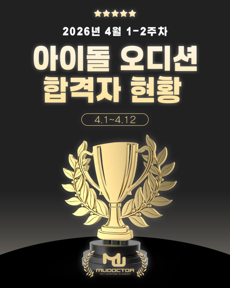 2026년 4월 1-2주차 (4월 1일 - 4월 12일) 안녕하세요! 뮤닥터 블로그지기입니다 따뜻한 봄을 잘 만끽하고 계시나요? 뮤닥터와 함께하는 뮤뮤들은 오디션 연습에 매진하며 아름다운 봄꽃이 되길 준비하고 있는데요~ 2026년 4월 1-2주차 오디션 합격자 뮤닥터 블로그지기와 알아보시죠! 아이돌 오디션 1차 합격 쇼파르 1차 합격자 [뮤닥터 일산점 내방오디션] 손*우 / 이*은 블릭스 1차 합격자 [뮤닥터 대구점 영상오디션] 신*호 어비스컴퍼니 1차 합격자 [뮤닥터 광주점 영상오디션] 김*원 바인 1차 합격자 [뮤닥터 강남점 일산점 내방오디션] 남*호 / 유*빛 / 최*서 오*영 / 정*린 / 손*우 그리드 1차 합격자 [뮤닥터 일산점 내방오디션] 손*우....... <img src="https://blogthumb.pstatic.net/MjAyNjA0MTZfNiAg/MDAxNzc2MzMxMTYxNzE2.TuPT6iZEpjkH1cWnTDjjHaE864-5MnkoFi-1pn_VHyUg.GOpXcN0uUfFIKrM-MdzOiWlIcPUuFbC8YDyAiMouk1cg.JPEG/4%BF%F9_%C7%A5%C1%F6.jpg?type=s3" />
